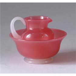 Lot 53 STEVENS & WILLIAMS CREAMER AND SUGAR Very nice signed Stevens & Willams rosaline and alabaster creamer and sugar ( probably from the Carder era). Creamer and sugar are each signed on bottom with Fleur-de-Lis mark and “Brierley Royal Crystal”. SIZE: Sugar is 4-3/4” dia. Creamer is 3-1/4” t. CONDITION: Very good to excellent. 5-71538