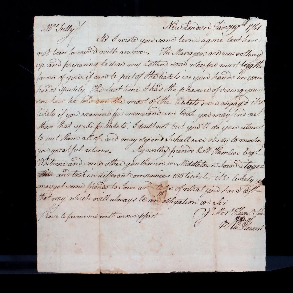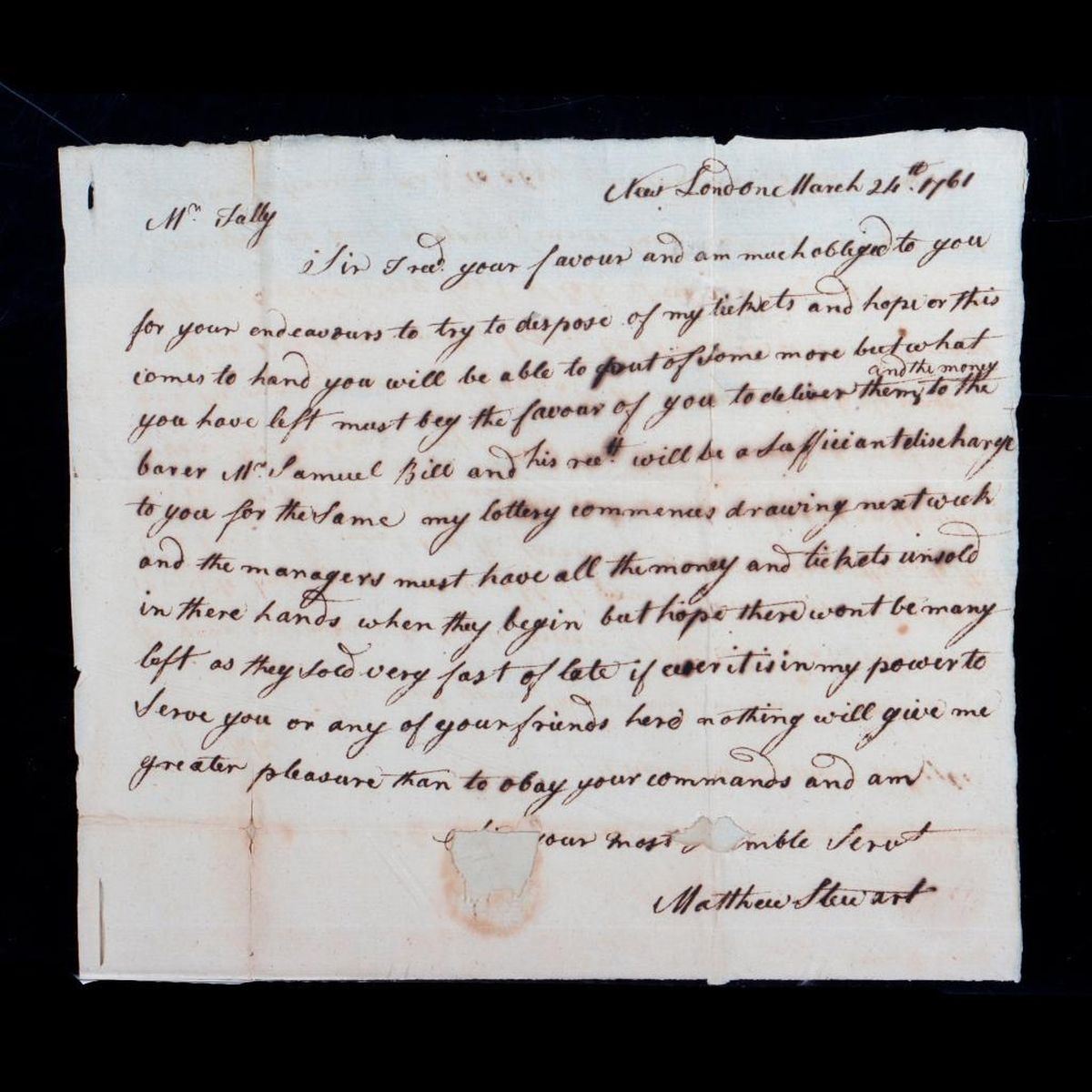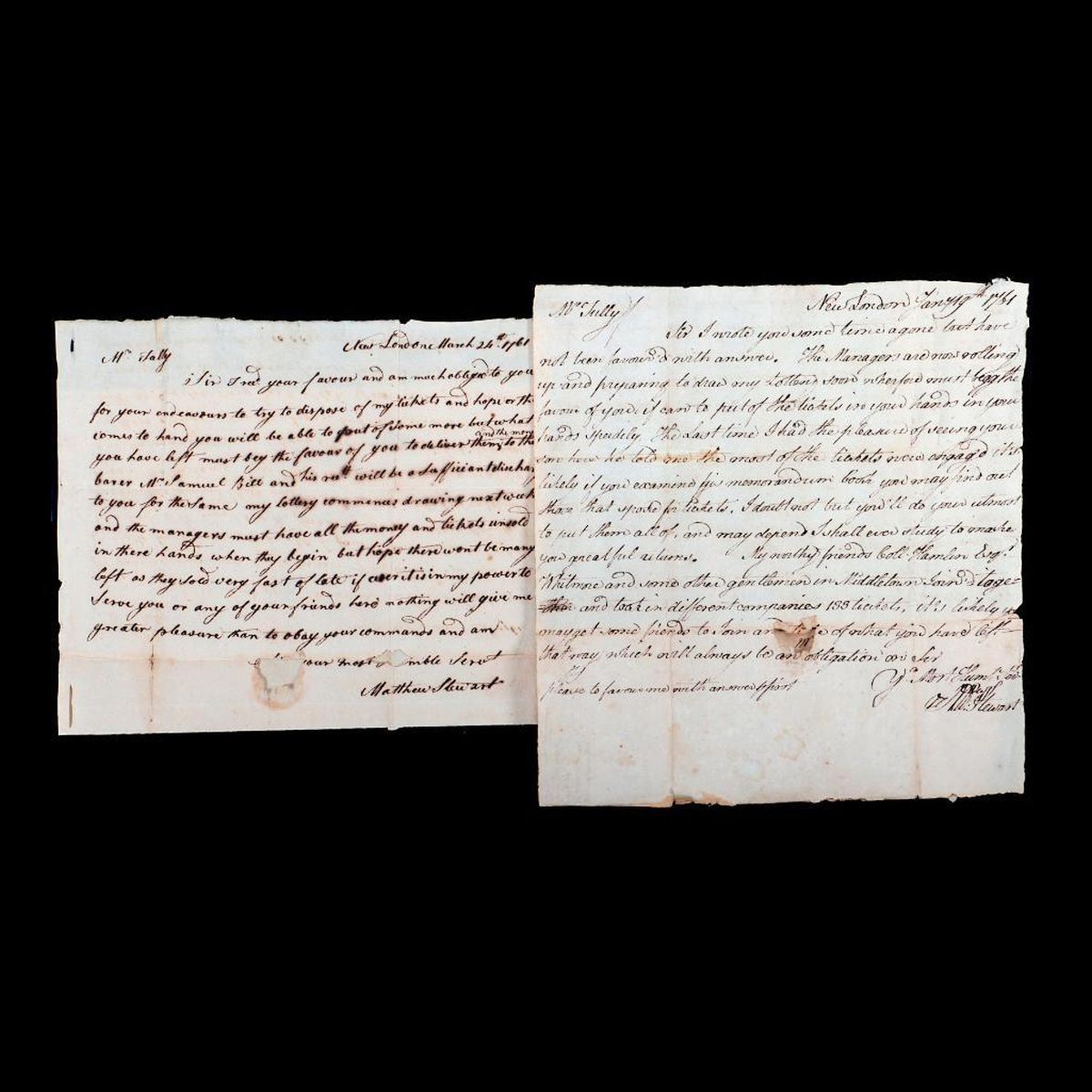 Two ALS to John Tully, Esq. Saybrook, concerning tickets for Matthew Stewart's Connecticut property sale by lottery. Stewart was a New London merchant who invested heavily in farmland, and by the 1750s devised a lottery sale scheme to stave off bankruptcy.* 1. Single-sheet ALS from John Stewart, New London, to John Tully Esq. in Saybrook, January (?), 1761. Addressed on one side, letter on the other. Stewart writes that the Managers are "...preparing to draw my lottery soon wherefore must beg the favour of you if can to put of the tickets... in your hands speedily," and promises him good returns. He adds: "My worthy friends Coll. Hamlin Esq(?), Whitmore and some other gentlemen in Middletown join together and took in different companies 133 tickets..." 11 3/8in. x 7 1/2in. Condition: Two vertical and three horizontal folds; several tears at fold creases and a hole at center where the wax seal attached (3/4in. x 1/4in.); toning, foxing/old dampstains; portion torn/missing from l/l; edge tears/folds. 2. Single-sheet ALS from Matthew Stewart in New London, to John Tully Esq. in Saybrook, March 24, 1761. Addressed on one side, letter on the other. Stewart thanks Tully for his "endeavors to try to dispose of" his property lottery tickets, and says he must "beg the favour of you to deliver them and the money to the barer(?) Mr. Samuel Bill..." He continues: "my lottery commences drawing next week and the managers must have all the money and tickets unsold in there hands when they begin..." 12 1/4in. x 7 3/8in. Condition: There are two vertical folds and at least four horizontal folds, with small tears in the creases, and four larger holes, the largest where the wax seal attached (1in. x 1/2in.); toning, foxing/old dampstains. *See the Connecticut Department of Transportation website (ct.gov 2022) for 18th-century homestead research of the Thomas Daniels Archaeological Site, which summarizes Matthew Stewart's lottery scheme. PLEASE NOTE: THE DOCUMENTS ARE TONED/DARKENED WITH AGE; IMAGES MAY APPEAR LIGHTER ON DIFFERENT SCREENS. This lot and the other Chapman-related items offered in this sale were part of a collection of papers and ephemera related to the family of Edward Mortimer Chapman (1862-1952), a Connecticut pastor, academic, and author, and a descendant of Robert Chapman, one of the first settlers of Saybrook, Connecticut (c. 1635).