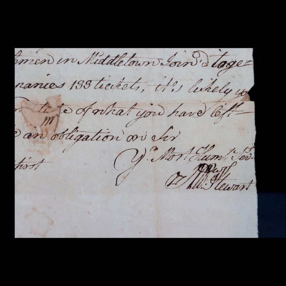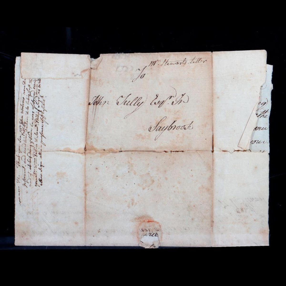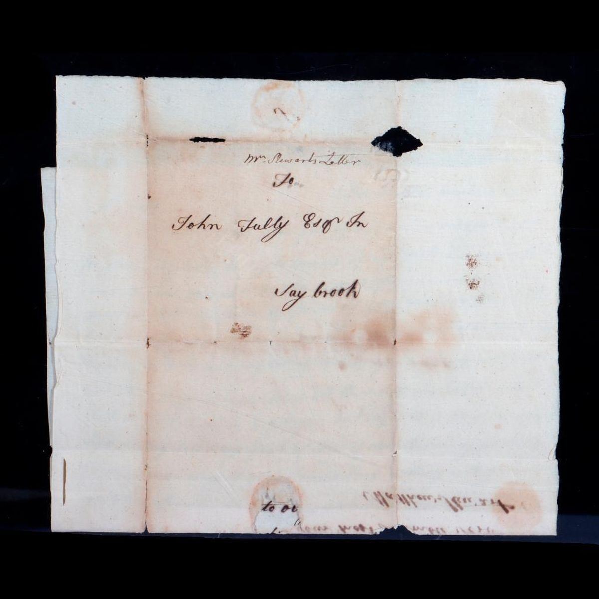 Two ALS to John Tully, Esq. Saybrook, concerning tickets for Matthew Stewart's Connecticut property sale by lottery. Stewart was a New London merchant who invested heavily in farmland, and by the 1750s devised a lottery sale scheme to stave off bankruptcy.* 1. Single-sheet ALS from John Stewart, New London, to John Tully Esq. in Saybrook, January (?), 1761. Addressed on one side, letter on the other. Stewart writes that the Managers are "...preparing to draw my lottery soon wherefore must beg the favour of you if can to put of the tickets... in your hands speedily," and promises him good returns. He adds: "My worthy friends Coll. Hamlin Esq(?), Whitmore and some other gentlemen in Middletown join together and took in different companies 133 tickets..." 11 3/8in. x 7 1/2in. Condition: Two vertical and three horizontal folds; several tears at fold creases and a hole at center where the wax seal attached (3/4in. x 1/4in.); toning, foxing/old dampstains; portion torn/missing from l/l; edge tears/folds. 2. Single-sheet ALS from Matthew Stewart in New London, to John Tully Esq. in Saybrook, March 24, 1761. Addressed on one side, letter on the other. Stewart thanks Tully for his "endeavors to try to dispose of" his property lottery tickets, and says he must "beg the favour of you to deliver them and the money to the barer(?) Mr. Samuel Bill..." He continues: "my lottery commences drawing next week and the managers must have all the money and tickets unsold in there hands when they begin..." 12 1/4in. x 7 3/8in. Condition: There are two vertical folds and at least four horizontal folds, with small tears in the creases, and four larger holes, the largest where the wax seal attached (1in. x 1/2in.); toning, foxing/old dampstains. *See the Connecticut Department of Transportation website (ct.gov 2022) for 18th-century homestead research of the Thomas Daniels Archaeological Site, which summarizes Matthew Stewart's lottery scheme. PLEASE NOTE: THE DOCUMENTS ARE TONED/DARKENED WITH AGE; IMAGES MAY APPEAR LIGHTER ON DIFFERENT SCREENS. This lot and the other Chapman-related items offered in this sale were part of a collection of papers and ephemera related to the family of Edward Mortimer Chapman (1862-1952), a Connecticut pastor, academic, and author, and a descendant of Robert Chapman, one of the first settlers of Saybrook, Connecticut (c. 1635).