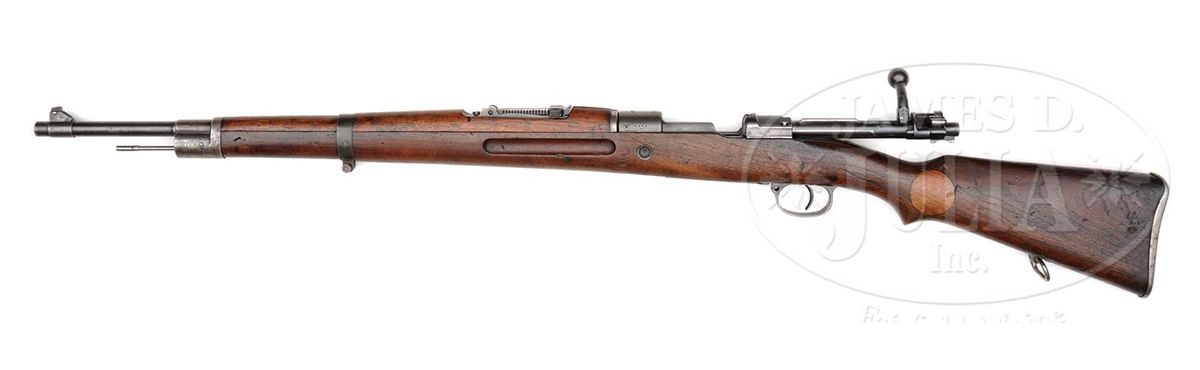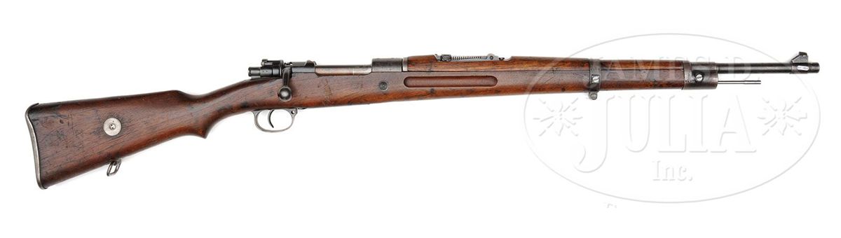 SN 1615a. Cal. 7.92mm. Scarce G29(Ö) manufactured under Nazi supervision in Austria in 1939. Rifle is marked 660 Steyr maker’s code and dated on top receiver, bears numerous WaA 623 proofs on right, Nazi era firing proof on left with SN. All metal parts are marked with the rifle SN's and WaA 623 to include small trigger guard locking screws. Has period matched K98 type bolt which is numbered to the gun, and all metal parts are marked WaA 623. Orig walnut stock is also numbered to the gun and bears several WaA 623 proofs on bottom and on right side. PROVENANCE: Collection of Dr. Geoffrey Sturgess. CONDITION: Overall good with bluing approximately 85% with wear on high edges. Stock has armoror's circular repair on left wrist. 4-53170 DW10
