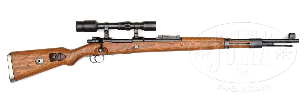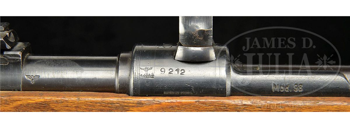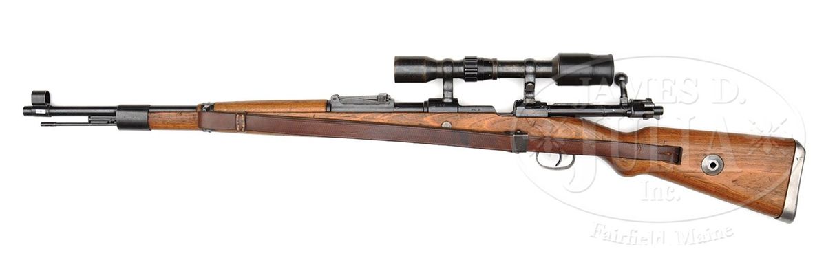 SN 9212. Cal. 8mm. Authentic SS "bnz" double claw K98 sniper rifle. Receiver top marked "bnz", representing Steyr, Austria, produced in 1944 with dovetailed double claw base in front and soldered base in rear. All weapon SN's match, rifle SN 9212, with the exception of the rear sight base which is factory mismatched one digit off, SN 9213, and with unnumbered front and rear bands. Left bbl marked with Nazi era firing proof, SN 9212, and Eagle over ZZA2 SS acceptance mark. Center focus Optotechnika four-power scope is marked "dow+", SN 4281, correct three-post reticle, and includes orig period rubber eye protector and leather scope carrying case with WaA marks. Authentic mounts are soldered to the scope body and unmarked. White glue laminate stock marked with single WaA 623 on wrist, and displays shallow bolt handle cutout typical of Steyr manufacture. Comes with authentic serviceable "L&F" marked leather sling. Overall correct and fine example of scarce SS double claw sniper. PROVENANCE: Collection of Dr. Geoffrey Sturgess. CONDITION: Very good to excellent. Scope is good, shows use with small dent on objective end, optics are slightly hazy. Bore is very good to excellent. Stock is very good with scattered handling marks and scratches. 4-53276 DW30