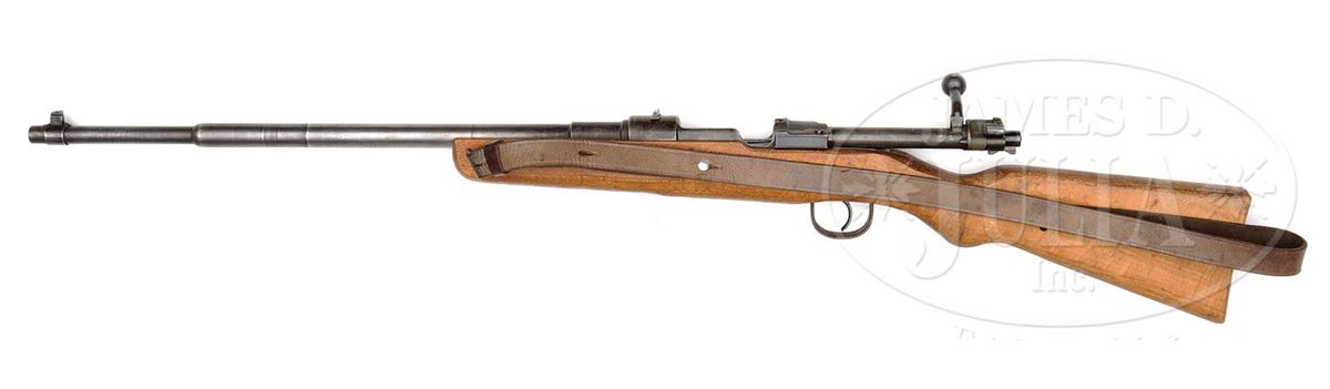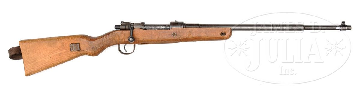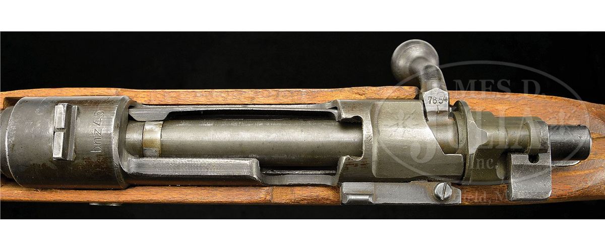 SN 7854. Cal. 8mm. Fine Steyr manufactured Volkskarabiner 98 manufactured in the last days of the war in Steyr, Austria to arm the People's Militia. This example has approximately 85-90% phosphate and blue finish, mechanically complete. Bolt group matches the receiver. Bbl is counter-bored at muzzle. Receiver is marked on top below dovetailed rear sight "bnz 45". Rough machined exterior, partially finished bbl is marked with Nazi era firing proof and SN "7854". Slab style beechwood stock displays haphazard coarse milling on sides and bottom, which reveals corner of magazine insert which is directly inserted into the wood of the stock. Marked "MR" at wrist. Overall nice representative example that comes with scarce authentic late war simplified leather sling with leather reinforcements. PROVENANCE: Collection of Dr. Geoffrey Sturgess. CONDITION: Very good to excellent. Bbl is in very good condition. Stock has numerous defects, scratches and gouges. 4-53238 DW26