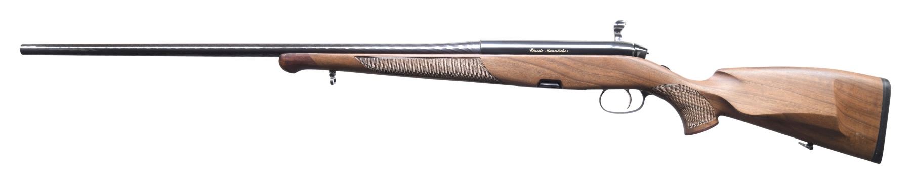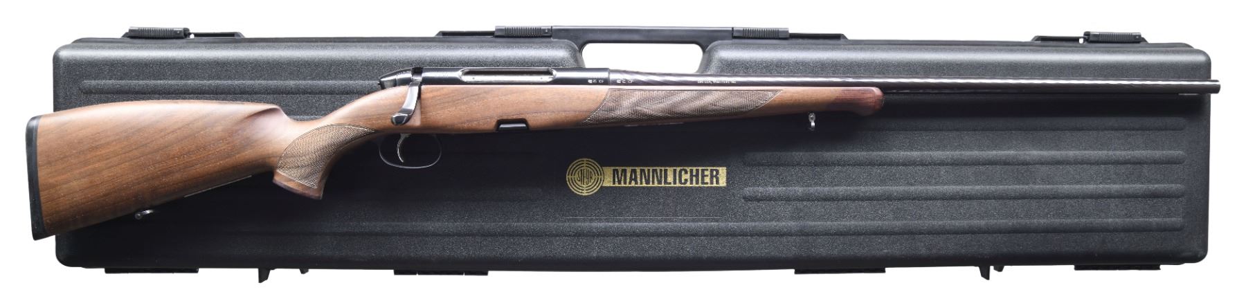 RIFLE. Cal. 300 Win Mag. S# 1052310. Bbl. 26" hammer forged w/o sights. Smooth two-lug action features butterknife bolt handle, top tang safety & single stage trigger. Half length walnut sporter stock. Features include European style comb & cheekpiece, contrasting grip cap & schnable tip, cut checkering & sling swivels. LOP: 14 1/4" over solid black pad. WEIGHT: 8 lbs, 5.8 oz. Mfg. 2000-2017. UNATTACHED ACCESSORIES: Mannlicher marked foam-lined hardcase w/ overbox containing instruction manual & guarantee card. CONDITION: as new, retaining virtually all wood & metal finish. Bright near excellent bore. (25-927/DS). MODERN. $2,000-2,700.