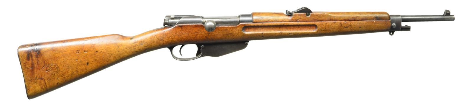 Cal. 6.5 Dutch. S# 1129P. Bbl. 18". Bolt parts are mismatched but other visible numbers are matching. Appears to be a New Model No. 1 Carbine or Old Model No. 4. Left side rail is marked "STEYR 1897". Adjustable rear sight graduated to 2000m. Inverted V front sight. Safety is not working & will likely require mechanical attention. Walnut stock w/ short handguard & left side magazine cover. Left side mounted sling swivels. No cleaning rod present. Right side of butt has 1925 Hembrug cartouche. CONDITION: walnut stock set shows a couple light chips, scattered dings & handling marks. Metal is primarily a gray patina w/ scattered traces of blue & some oxidation staining. Good bore w/ some pitting & frosting but strong rifling. (01-21338/MJC). ANTIQUE. $400-600.