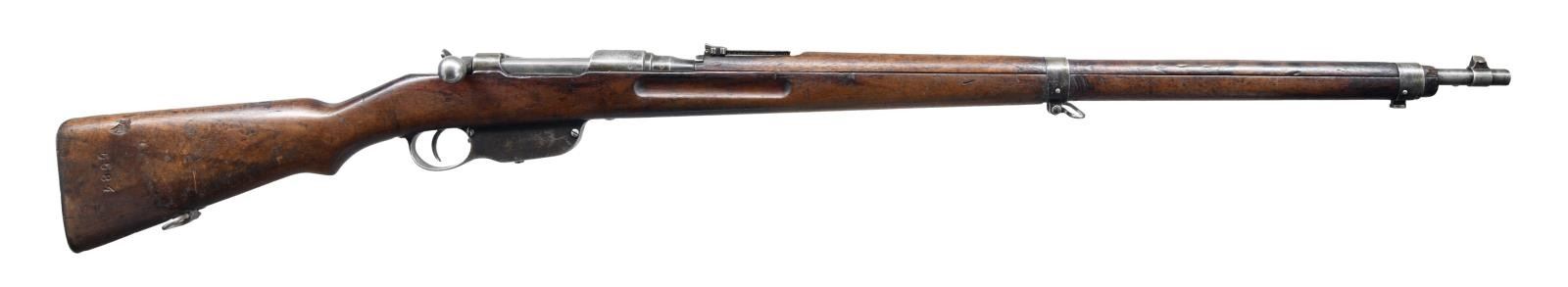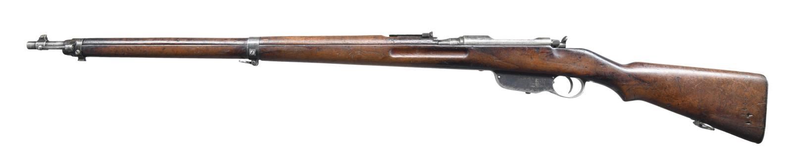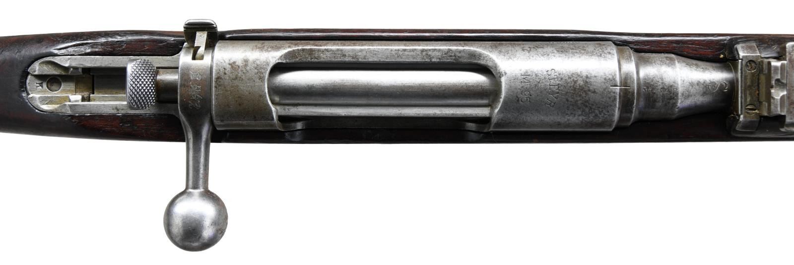Cal. 8x56. S# 8042p. Bbl. 31". Matching numbers on bbl. & electropencil matching number on bolt. Other parts unnumbered or mismatched. Top of receiver marked "STEYR/M.95". Top of bbl. marked "S" for update to 8x56 & w/ Austrian "Wn (Eagle) 17" acceptance. Ladder rear sight graduated to 2600 Schritt. Blade front sight. European hardwood stock set. CONDITION: stock set has arsenal rework finish w/ some roughness & cracks on butt, scattered dings & handling marks. Metal is a silvery gray patina w/ some light pitting on mag & overall scattered oxidation staining. Worn bore w/ scattered pitting & frosting. (23-2031/MJC). CURIO. $300-500.