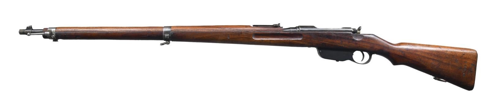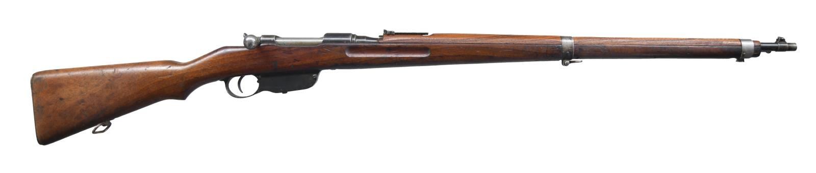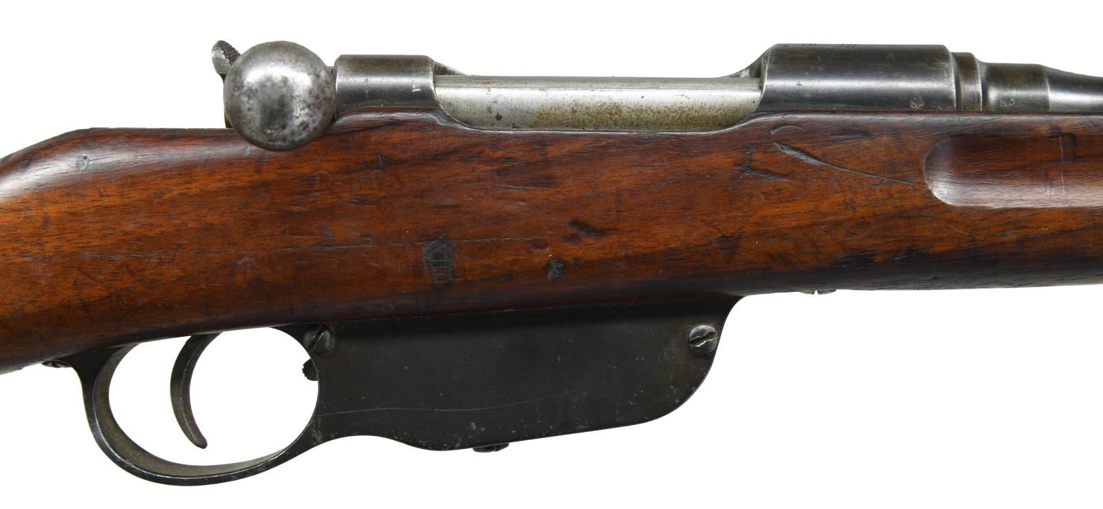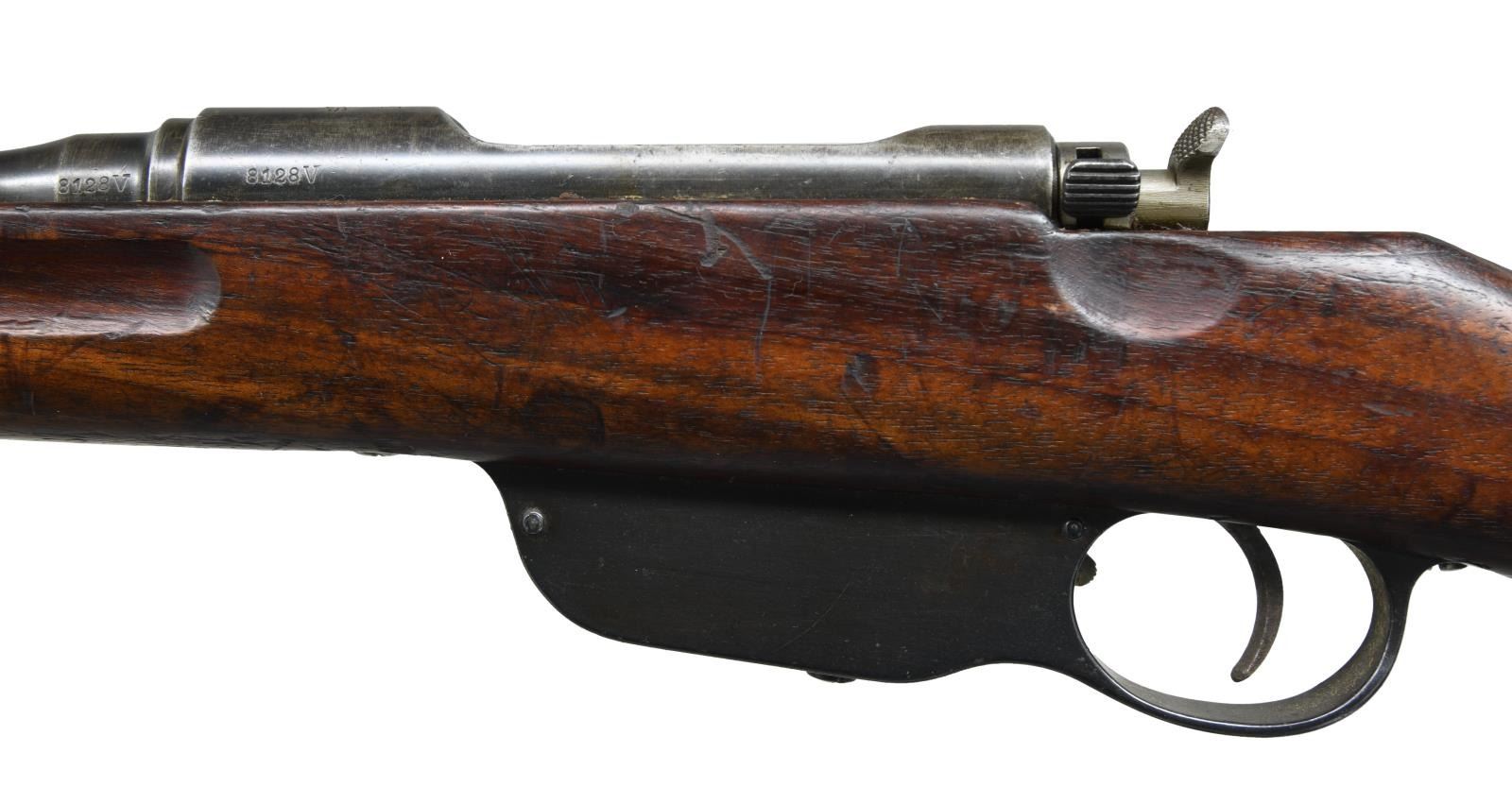 Cal. 8x56. S# 8128V. Bbl. 31". Matching numbers on bolt handle, bbl. & right side of butt. Top of bbl. marked w/ Austrian eagle, 17 date & "S" marking for update to 8x56 round. Top of receiver marked "STEYR/M.95". Ladder rear sight graduated to 2600 Schritt. Blade front sight. Hardwood stock w/ elm handguard. Bottom mounted sling swivels. CONDITION: stock set shows scattered dings & handling marks. Metal retains 30% arsenal blue w/ overall fading to brown, some pitting on mag body & scattered oxidation. Good bore w/ some pitting & frosting but strong rifling. (23-2028/MJC). CURIO. $300-500.