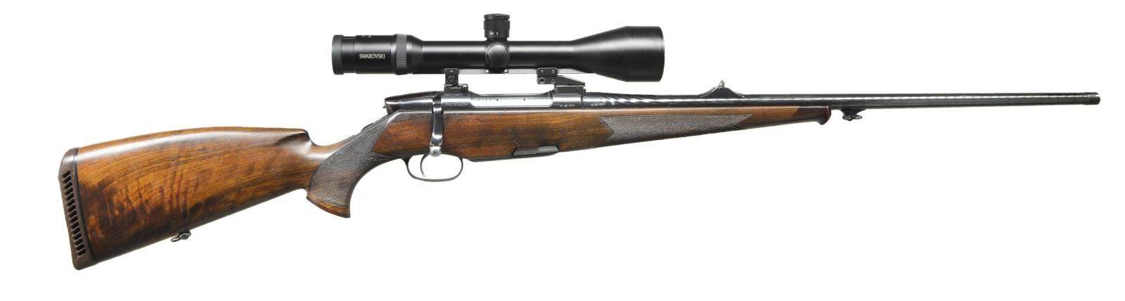 SWAROVSKI SCOPE. Cal. 300 Win Mag. S# 232181. The 25 1/2" roto-forged bbl. has single leaf V-notch rear sight in island base, muzzle without sight is threaded for moderator (not present). Action with Steyr markings on left side has serial number and proofs on right along with "MADE IN AUSTRIA". Top of action is fitted with ERA Q-D scope mounts. Action is fitted with single stage trigger with roll safety on top tang. Bottom metal is made for quick release 3 rd. factory magazine. Capped pistolgrip stock with hogback comb measures 14 5/8" over opensided brown pad and features Tyrolean cheekpiece, schnabeled rosewood forend tip and rosewood gripcap with bottom having inlet white oval depicting a scrimshawed wild boar, which is also marked "Y. LE BAILLIF. M.O. Fp". Point pattern checkering is at grip and around forend. Rifle is mounted with Swarovski 2.5-10x Habicht rail scope with crosshair, dot and three post reticle in Q-D swing off ERA mounts. MAGS: 1 factory 3 rd. UNATTACHED ACCESSORIES: black plastic case. CONDITION: very good, metal parts retaining about 80% original blue with wear overall. Stock retains most of its original oil finish with a number of marks, most very light. There are two repaired cracks through grip section running from top tang on left toward trigger, which presently do not flex. Bore is bright and shiny. Scope is very fine with only one or two minor dings in exterior. Two extra holes are drilled through rail. Optically crystal clear. (22-4971/MGM). CURIO. $1,500-2,200.