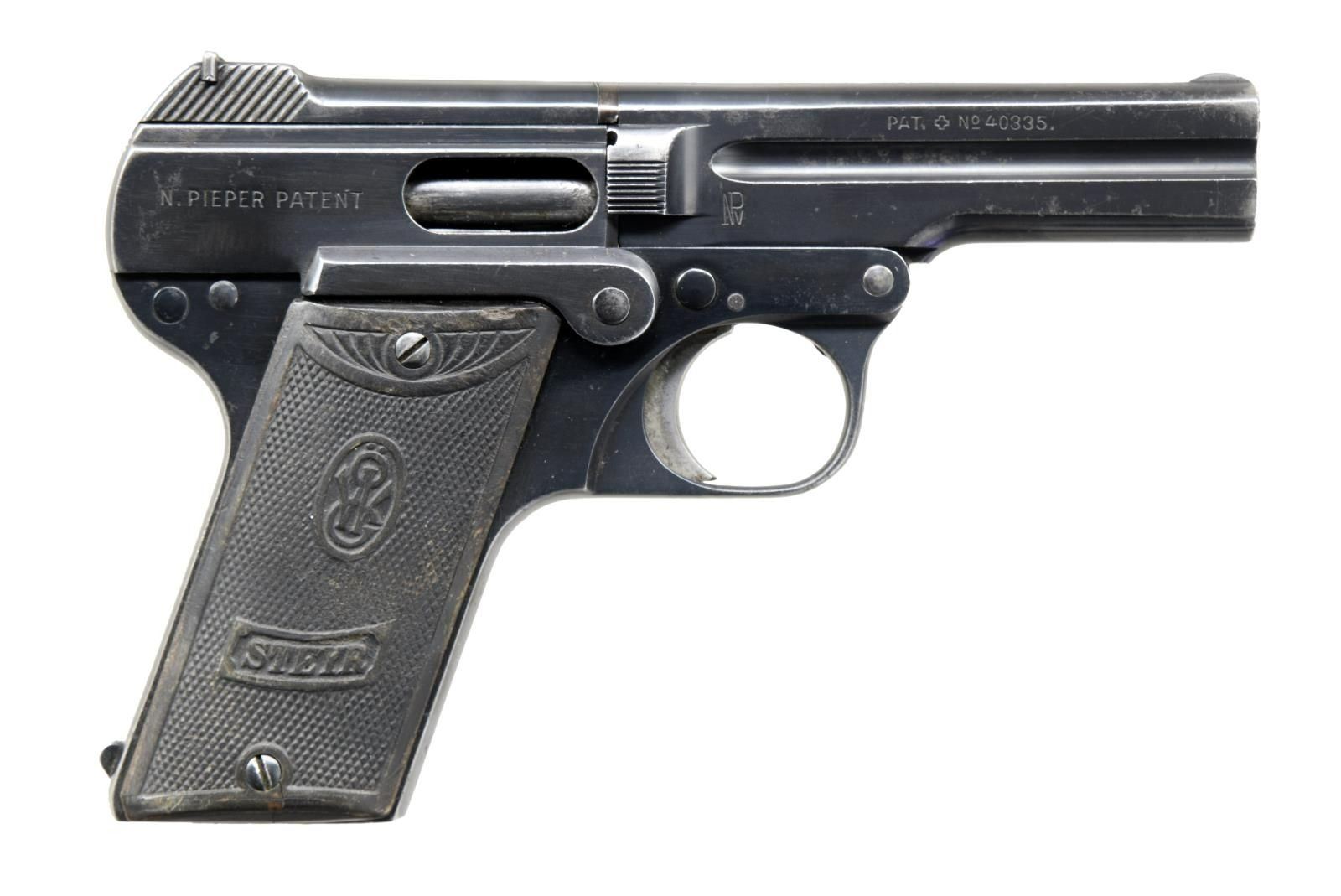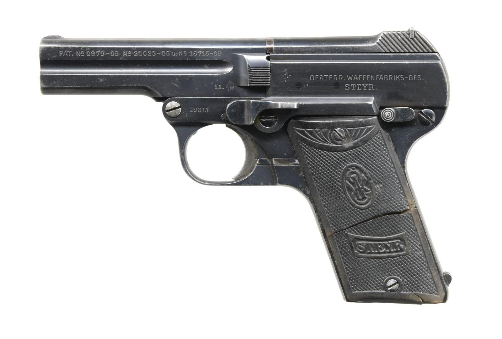 Cal. 7.65mm (32 ACP). S# 29313. Bbl. 3 1/2". Round blade front sight. V-notch rear sight. Right side of bbl. has Austrian "NPV" proof. Left side of bbl. has "11" date denoting 1911 mfg. Blue finish. Hard rubber grips w/ Steyr logo. MAGS: 1-7 rd. CONDITION: left grip panel has a large crack running across in middle. Grips otherwise show a couple smaller cracks, some flaking, chips, dings & handling wear. Metal retains 85% original blue w/ some moderate pitting on the high edges, a few light dings, scattered light oxidation fading to brown & edge wear. Fair bore w/ scattered light pitting & frosting but evident rifling. The Collection of Curtis H Halvorson. (23-5858/MJC). CURIO. $300-400.