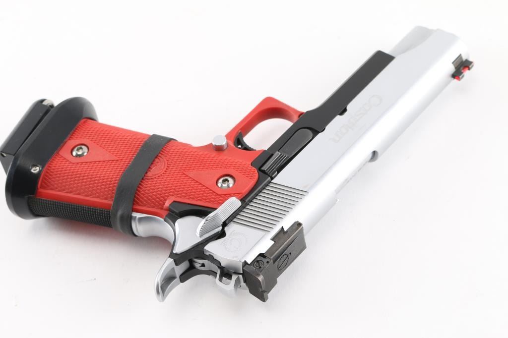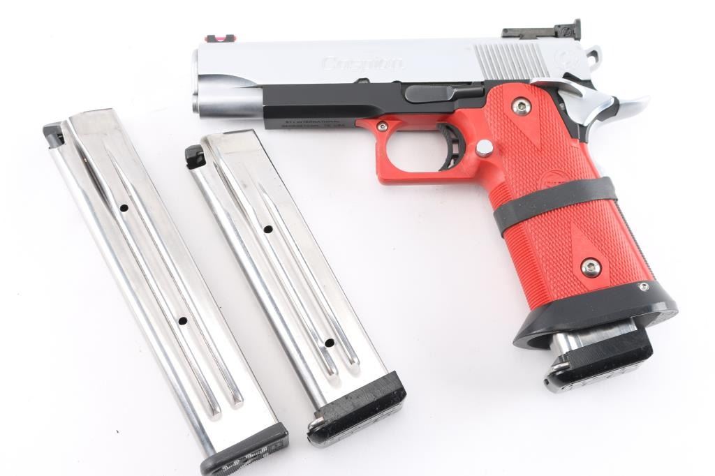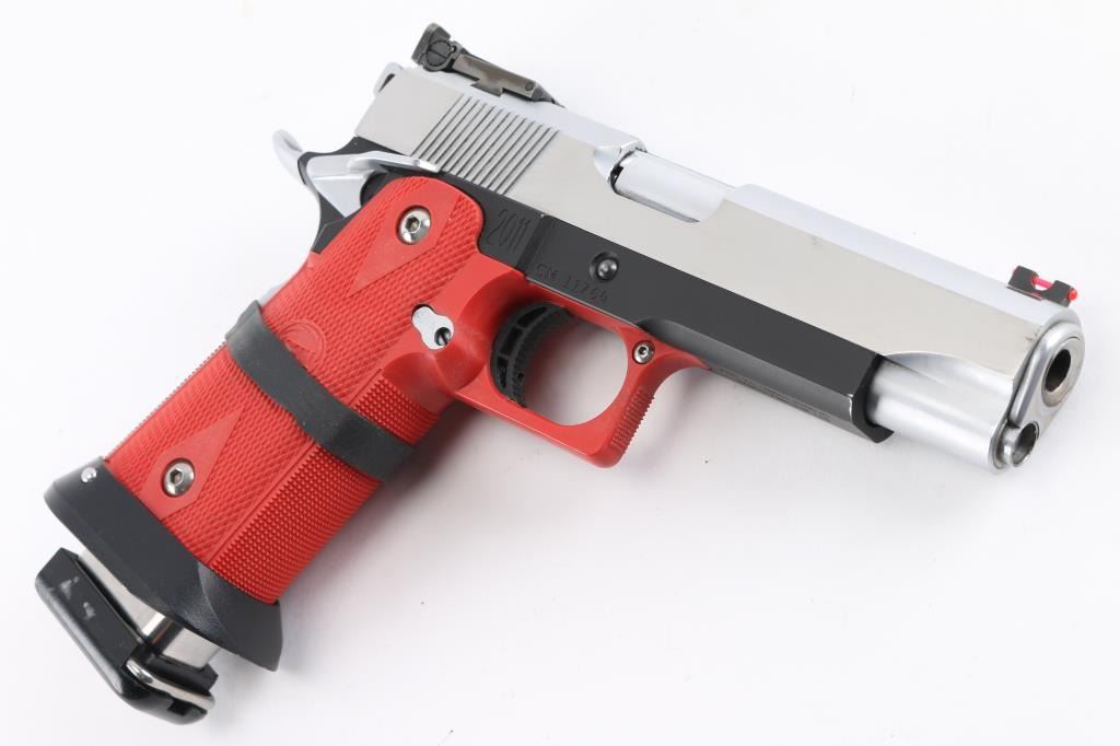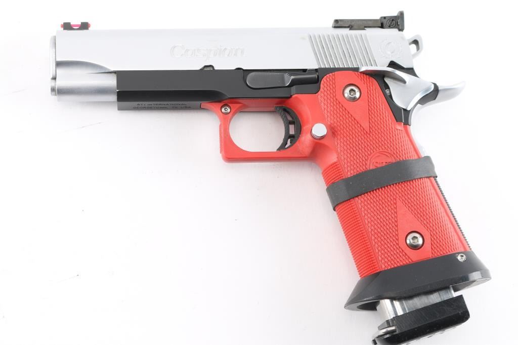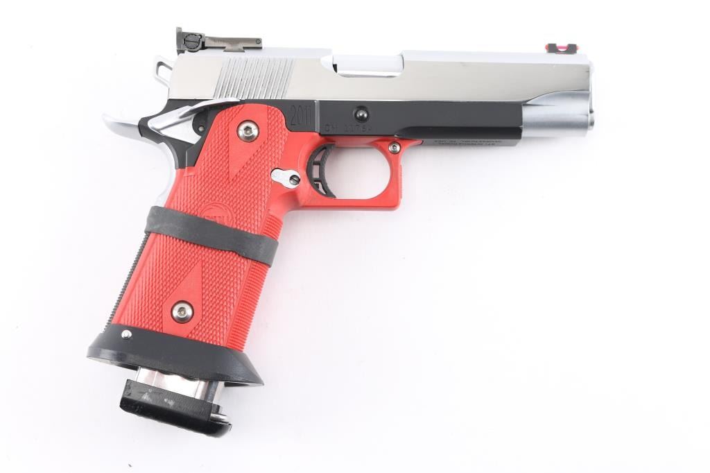 Custom high quality semi-Automatic 9mm competition pistol. Double stack magazines. Stainless steel Caspian Arms slide with red fiber optic front and Champion adjustable rear sights slide, 4 1/2" stainless barrel, full length guide rod. Mounted on a STI 2011 black alloy unramped frame with skeletonized STI trigger with adjustable stop. knurled, flat mainspring housing, knurled fore strap, stainless beavertail grip safety, stainless ambidextrous extended thumb safety. Red polymer grip/triggerguard with STI wide,beveled, Anodized Aluminum magwell Bore appears excellent/bright. Grips are excellent. Slide has a few minor scratches. Frame and grip are excellent, Comes with two 20 rd magazines and one 26 rd magazine. (3) total.