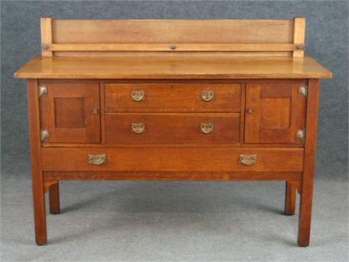 STICKLEY BROTHERS OAK SIDEBOARD with platerack model 8208 with metal tag circa 1910 <BR>condition: excellent, with top and platerack refinished, base original. 16 hammered hardware brads have been replaced.
