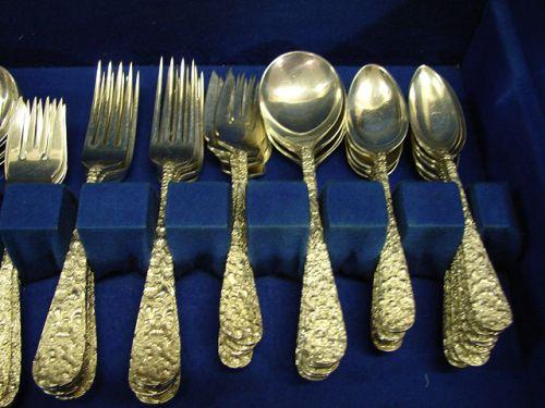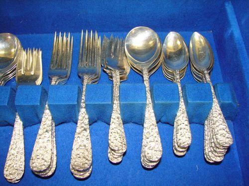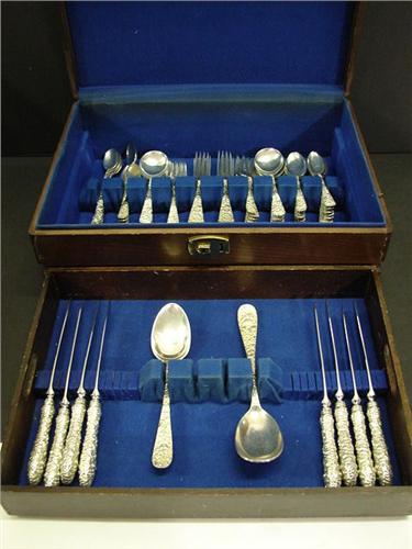 61 PIECES OF STIEFF ROSE BY KIRK STIEFF, 1892 STERLING FLATWARE. Consists of 8 fruit spoons (6” L), 10 five o’clock teaspoons (5.5” L), 10 soup spoons (6.5” L), 9 salad forks (6” L), 8 dinner forks (6.75” L), 1 teaspoon (5.75” L), 4 iced tea spoons (7.37