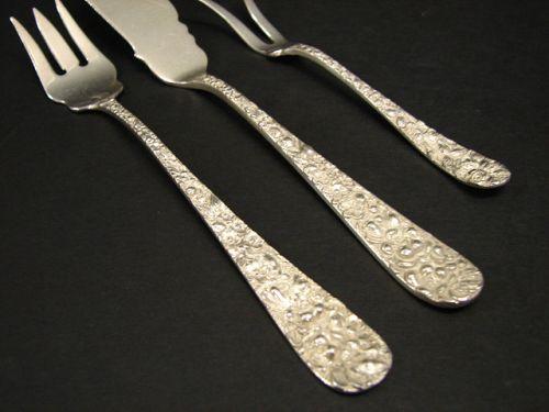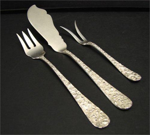 THREE PIECES OF STIEFF ROSE STERLING FLATWARE. Consists of cocktail fork (6” L), lemon fork (4.5” L), & butter spreader (7” L).