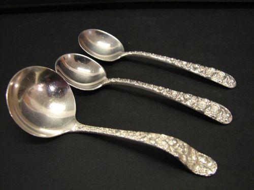THREE PIECES OF STIEFF ROSE STERLING FLATWARE. Consists of two baby spoons (4.125” L) & one small ladle (4” L).