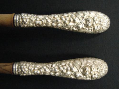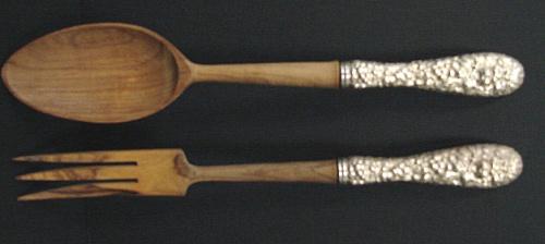 STIEFF STERLING SILVER SALAD SET. Consists of wooden salad serving fork and spoon with sterling handles. Both handles are marked. 10.5" L