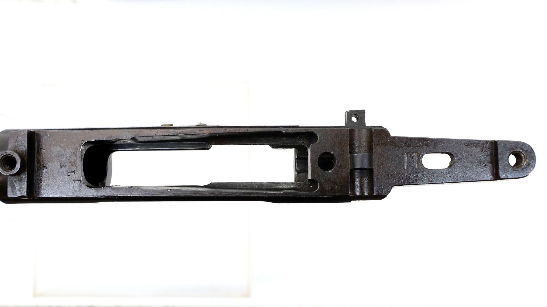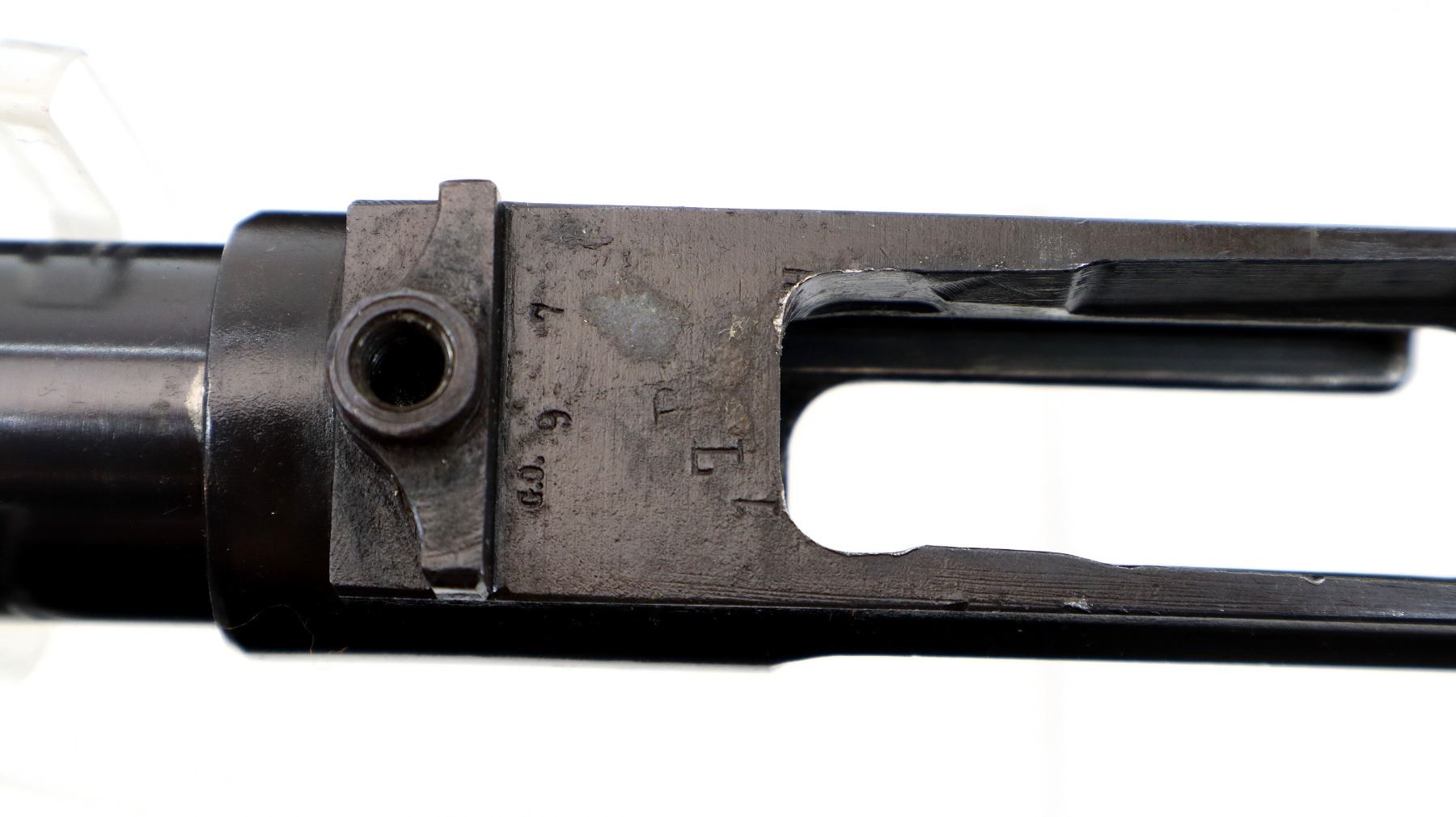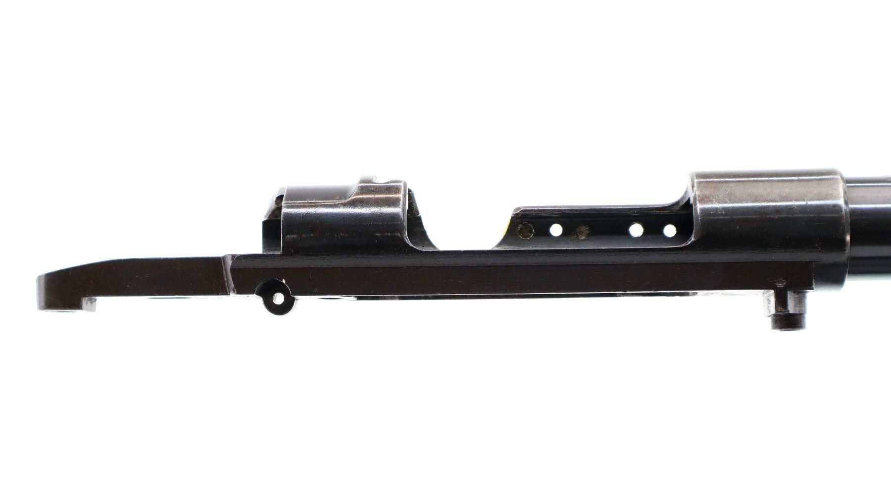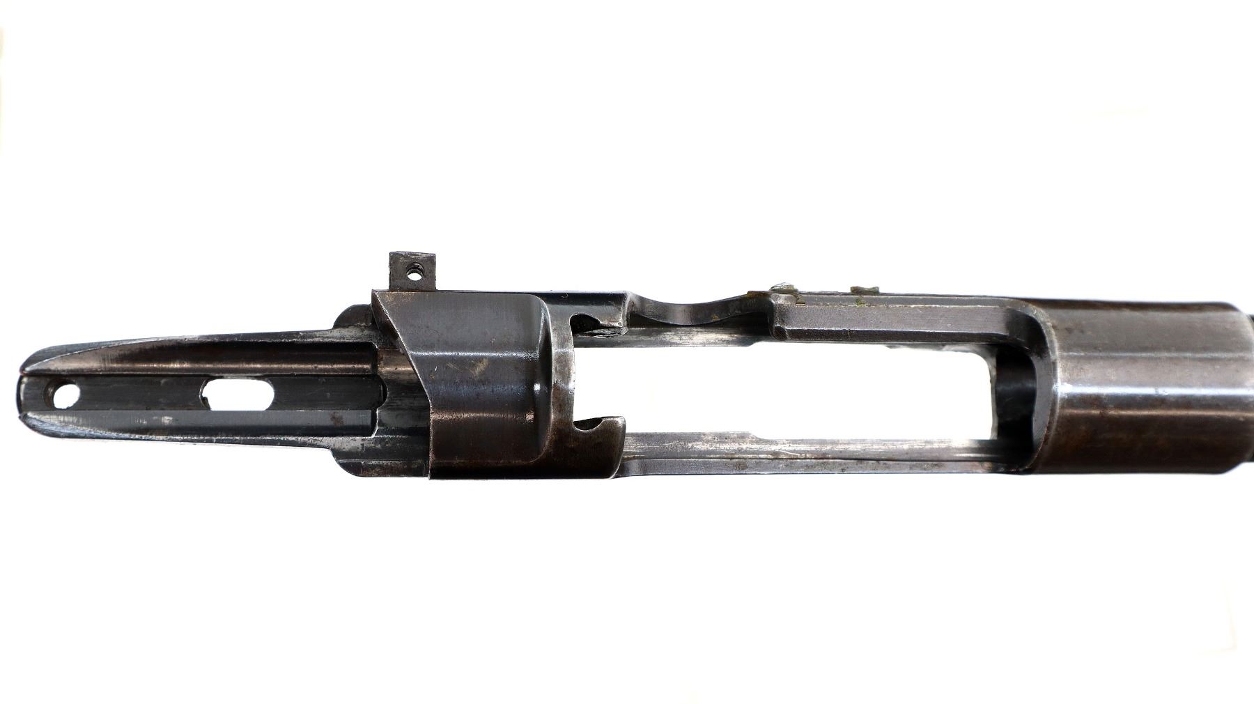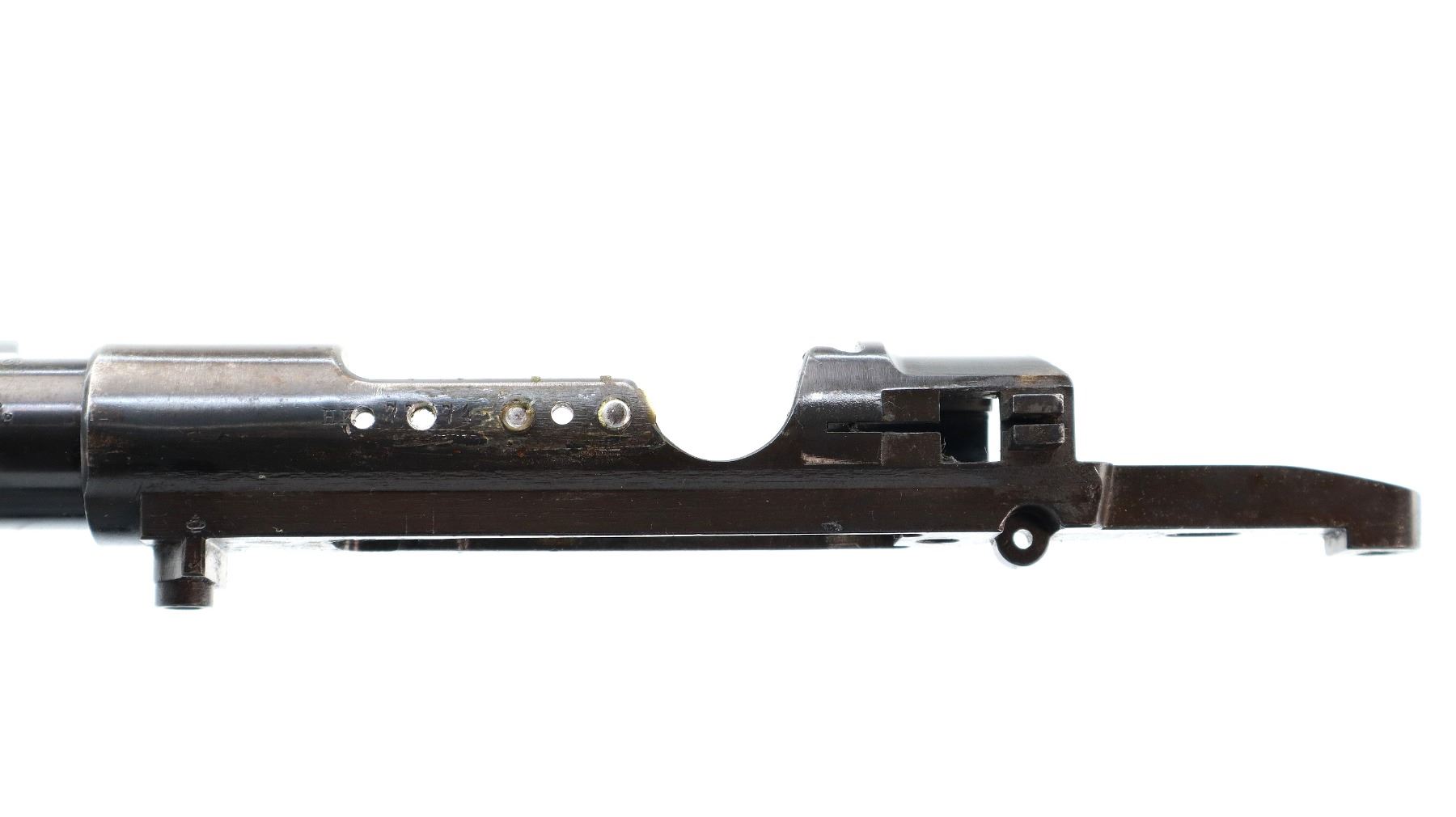 Main Description: Missing front sight ramp is present. No rear sight dovetail is present, blued finish, left side of receiver drilled and tapped with 2 plugged holes, does not include any other parts.
