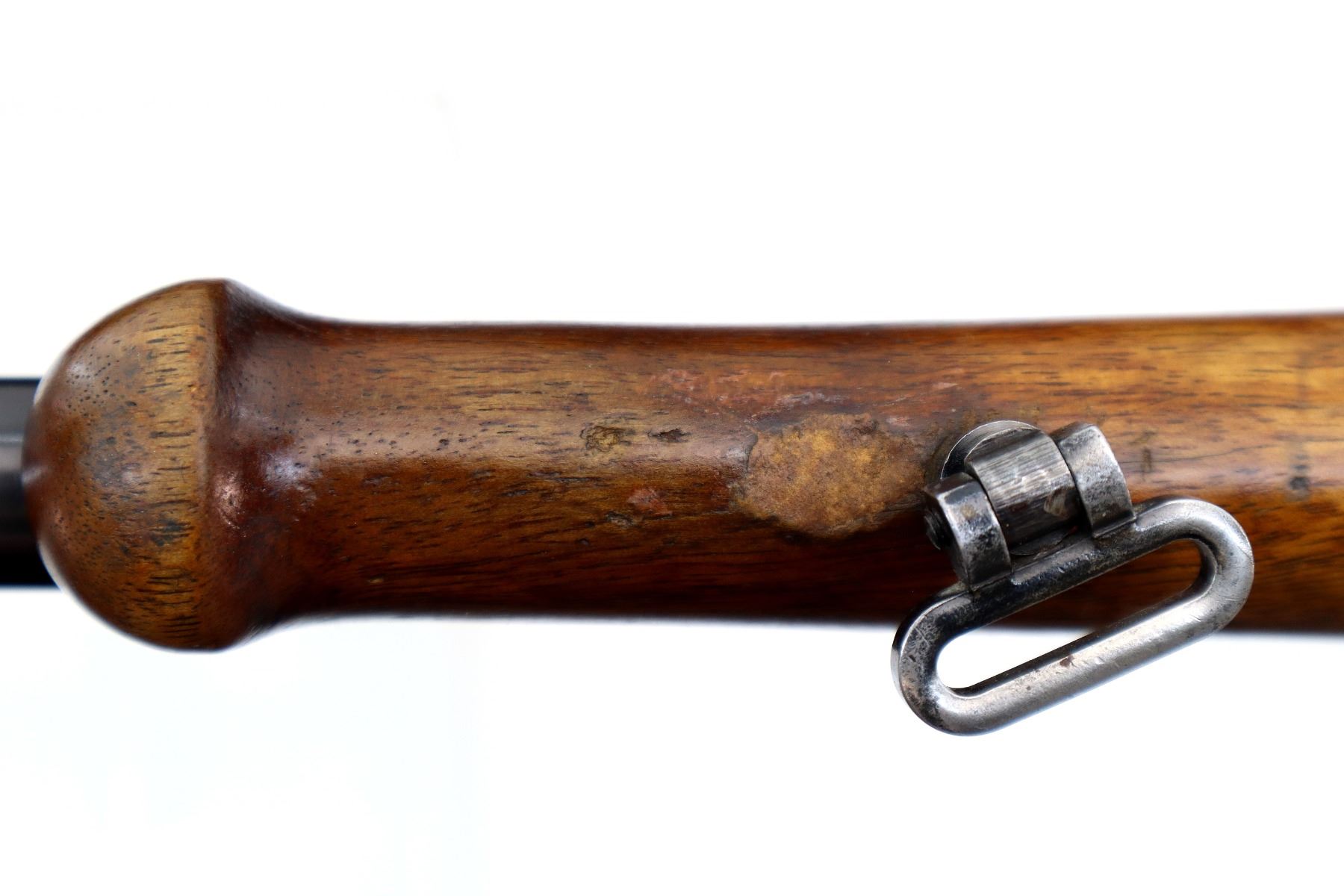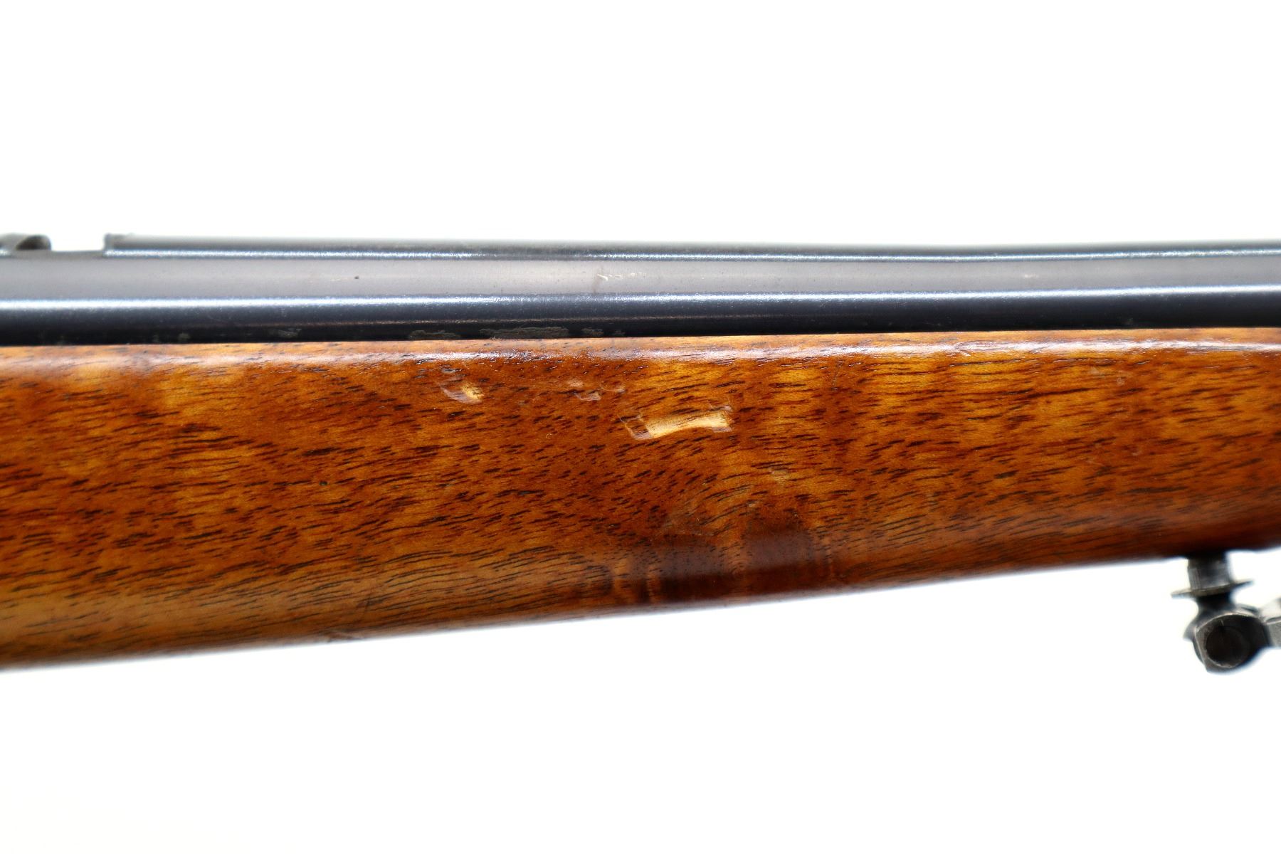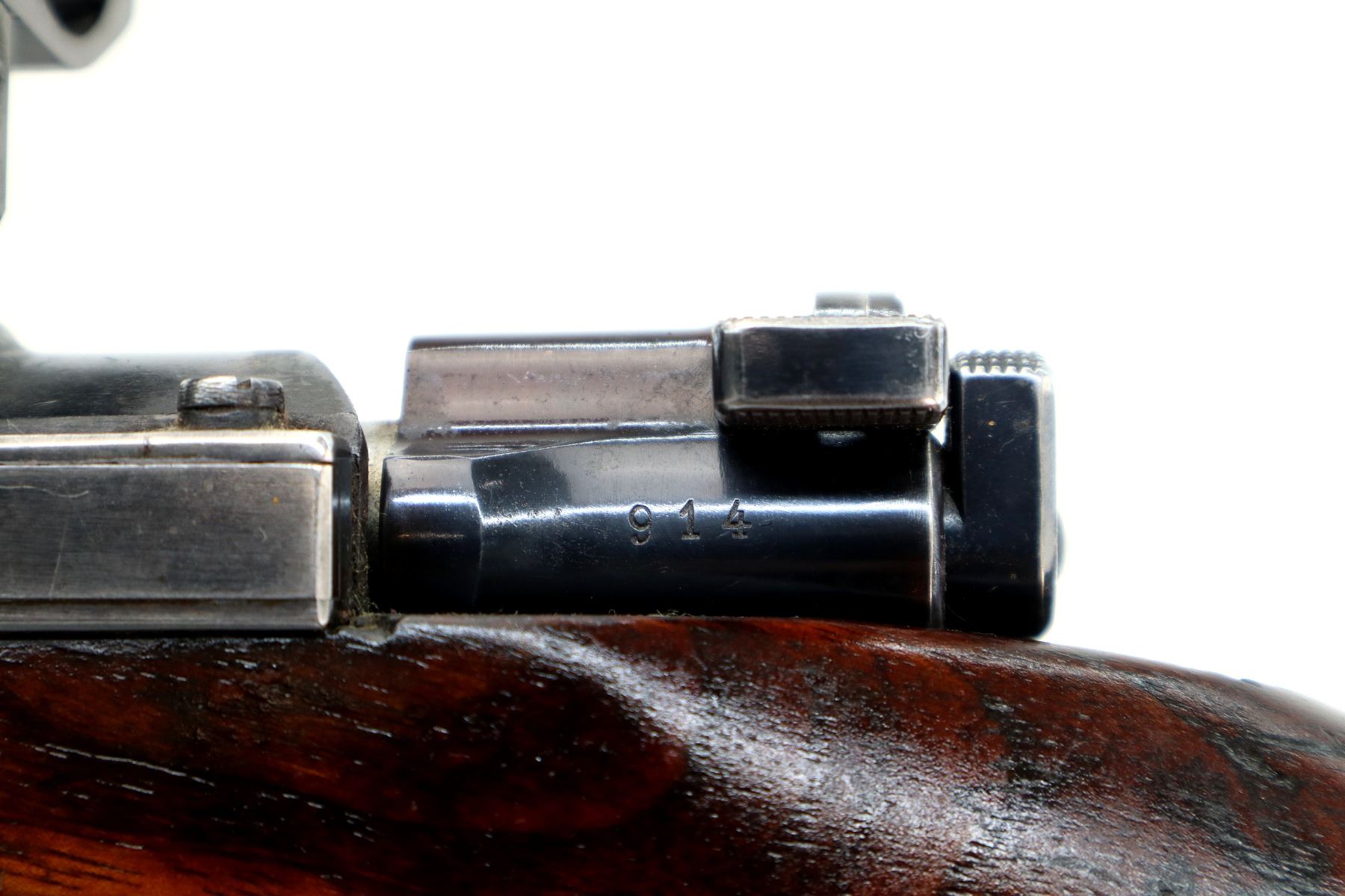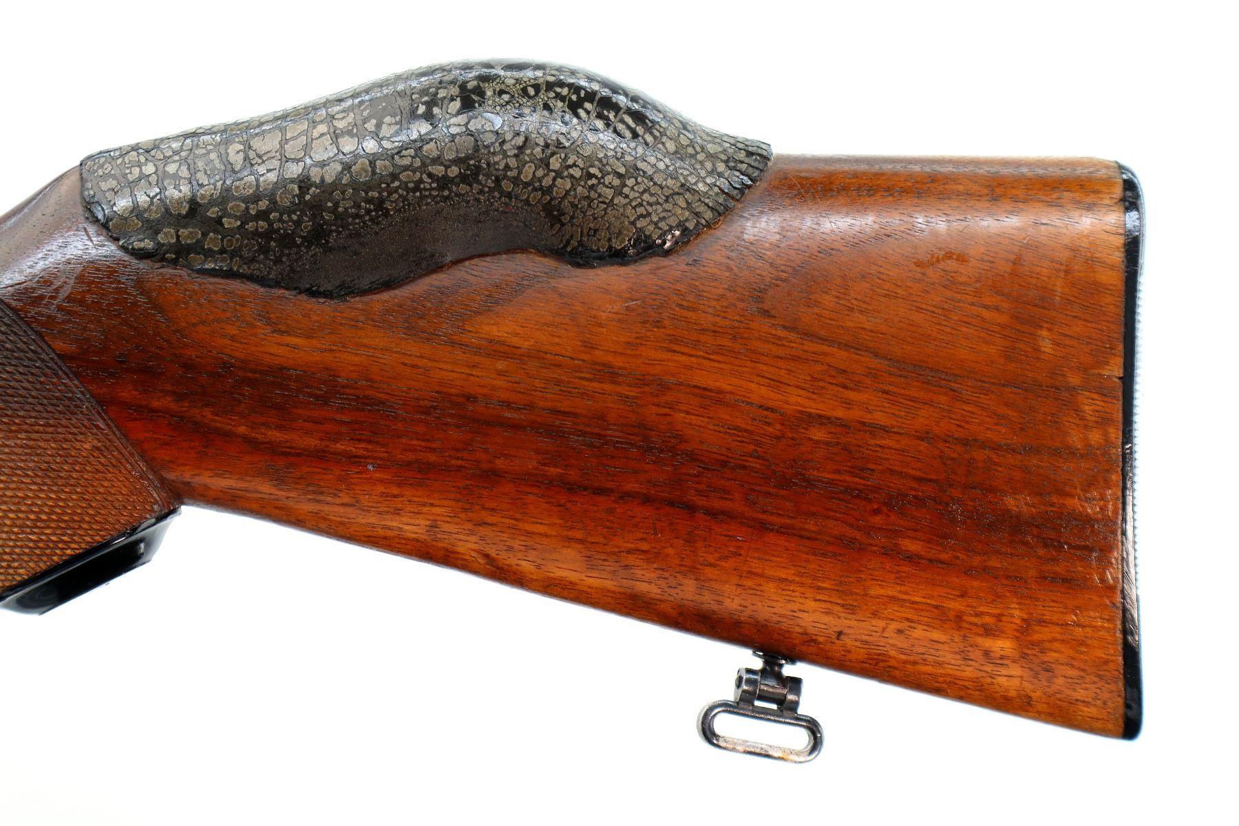 Main Description: Blade front sight with ramp, missing rear sight dovetail present, blued finish, receiver drilled and tapped with unknown scope mount 1" rings installed, modified bolt handle with flat sided knob. One piece wood stock, Schnabel forend tip, checkered pistol grip cracked behind receiver, modified comb, grooved black polymer butt plate, grip cap, sling swivels.