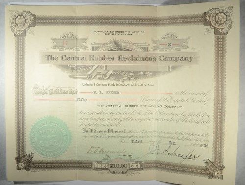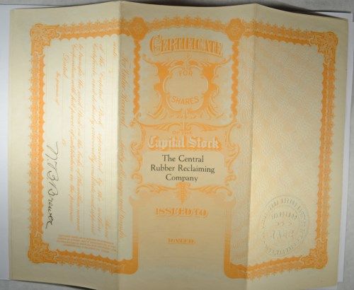STOCK CERTIFICATES FROM CENTRAL RUBBER RECLAIMING COMPANY FINDLAY, OH