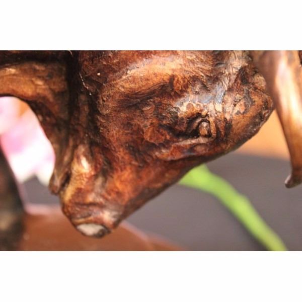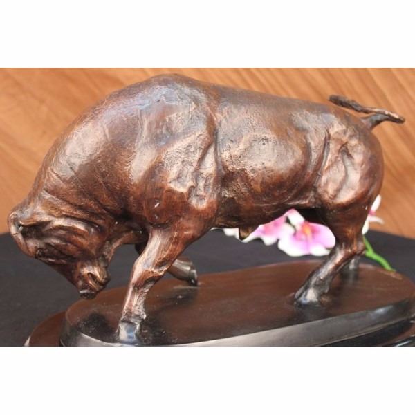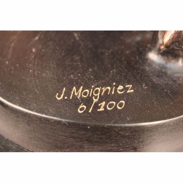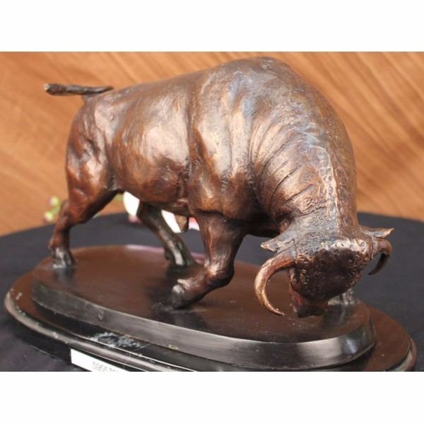 This magnificent sculpture is of a charging bull. With his head down, his nostrils' flared and his muscles tightened he stomps the ground before him, releasing a vibrating grunt, he smells the ground before him. All he see's now is red and he is raging angry, his horns are sharp and solid and he prepares to charge his nemesis and take him down. He is an extremely muscular and dense creature, thick rolls of muscle and fat around his neck for protection, he was made for these sorts of confrontations of physical strength. His tail curls up in a swift motion and off he goes, frozen in his pose and replicated in a true masterpiece of bronze artwork. Handmade of 100% bronze and resting on a solid black marble base this sculpture has a two tone brown patina and is cast using the ancient "Lost Wax Method". Signed J. Moigniez.Jules Moigniez was born in Senlis sur L'Oise, France in 1835 and died in Saint-Martin-du-Teire, France on May 29, 1894. The son of a metal gilder, Moigniez was a student of Paul Comolera. He debuted at the Exposition Universelle in 1855 with Pointer and Pheasant and Falcon and Weasel each in plaster. He contributed regularly to the Paris Salon from 1859 to 1892 during which he exhibited over thirty sculptures including Pointer and Pheasant and Falcon and Weasel in bronze. He was awarded an honorable mention at the Salon and received a medal in London at the Great Exposition in 1862. He lived most of his life in Paris. During his career he was widely popular in France, England and America. His bronzes were most decorative, particularly those of game birds. He also sculpted dogs, farm animals and equestrian groups. Moigniez's dogs reflected the "naturalism" style of Pierre Jules Mene. His bird sculptures were reminiscent of paintings by deHondecoeter, Casteels and Snyders. His sculptures of birds reflect dynamic movement, as if captured through a high-speed photographic portrait. Moigniez bronzes were edited, (cast), by the foundry his father opened in 1857. A wide variety of patinations, including silver plate, golden bronze and gilding were unique to these lifetime casts.Condition: This sculpture is in a very good condition. Bronze Dimensions with Marble Base:Height 11" X Width 17"Marble Dimensions: 16" X 9"Height without base: 10" Weight :35 LBSInventory; 68545955786 This magnificent sculpture is of a charging bull. With his head down, his nostrils' flared and his muscles tightened he stomps the ground before him, releasing a vibrating grunt, he smells the ground before him. All he see's now is red and he is raging angry, his horns are sharp and solid and he prepares to charge his nemesis and take him d