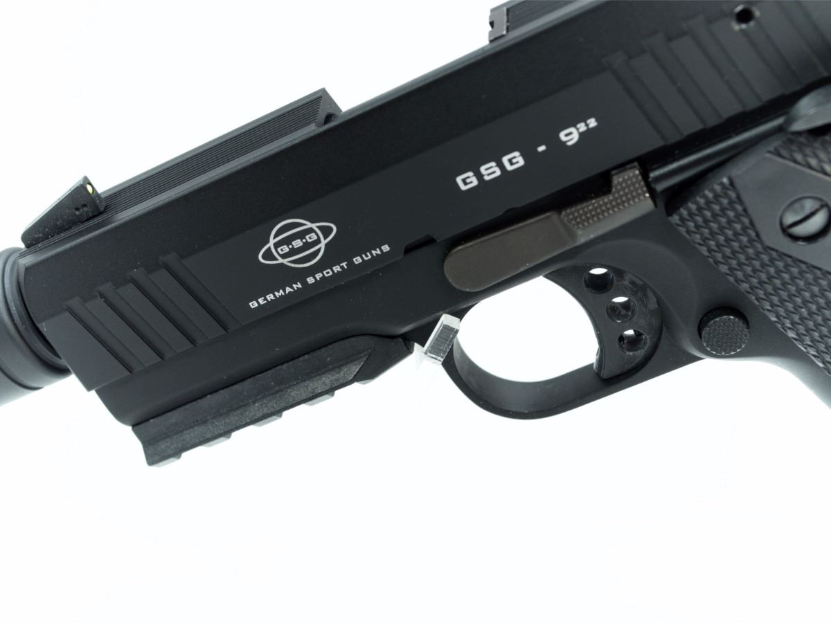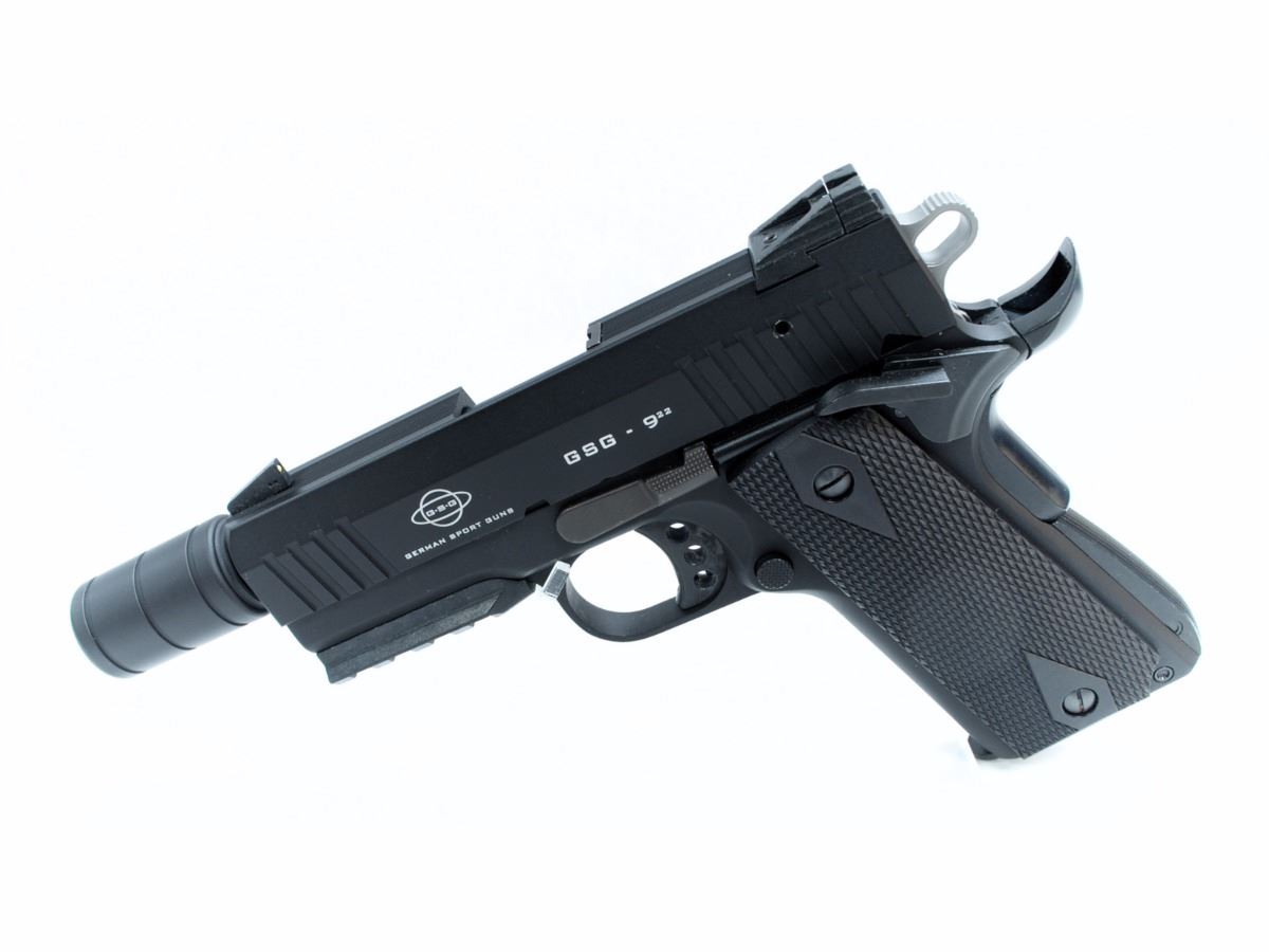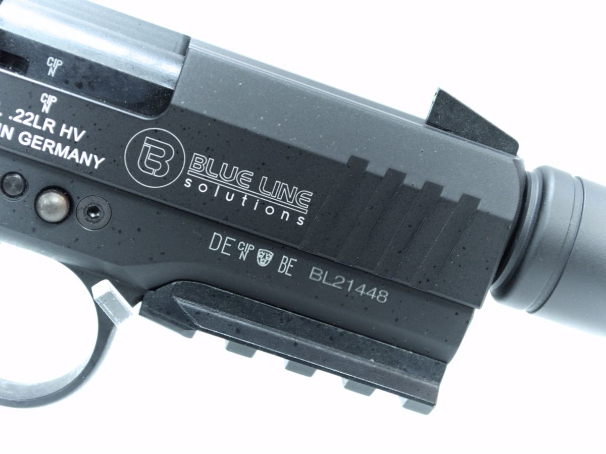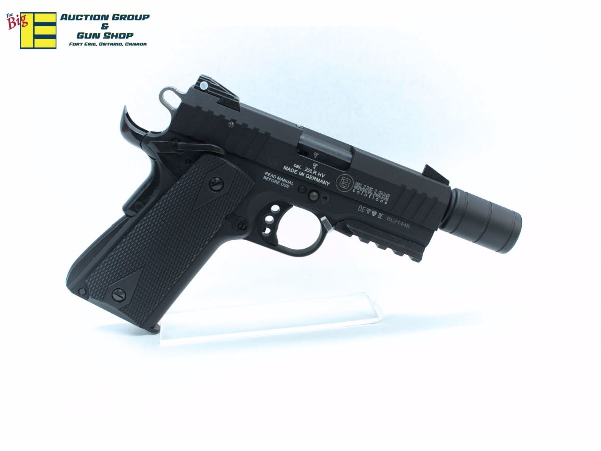 GERMAN SPORTS GUN, Blue line Solutions, Model GSG- 922, Fake suppressor, 1 Mag Black Checkered Grip, Condition New in box, Made in Germany,Canadian Restricted Class. SN. BL 21XXX.