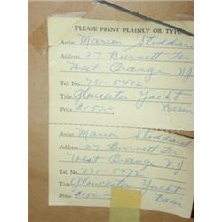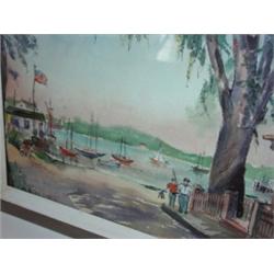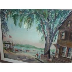 STODDARD, MARION WATERCOLOR PAINTING "GLOUCESTER YACHT BASIN". Depicts ships on water from town. Signed in lower left. Labeled with title and artist on reverse. 21.5" x 18" framed.