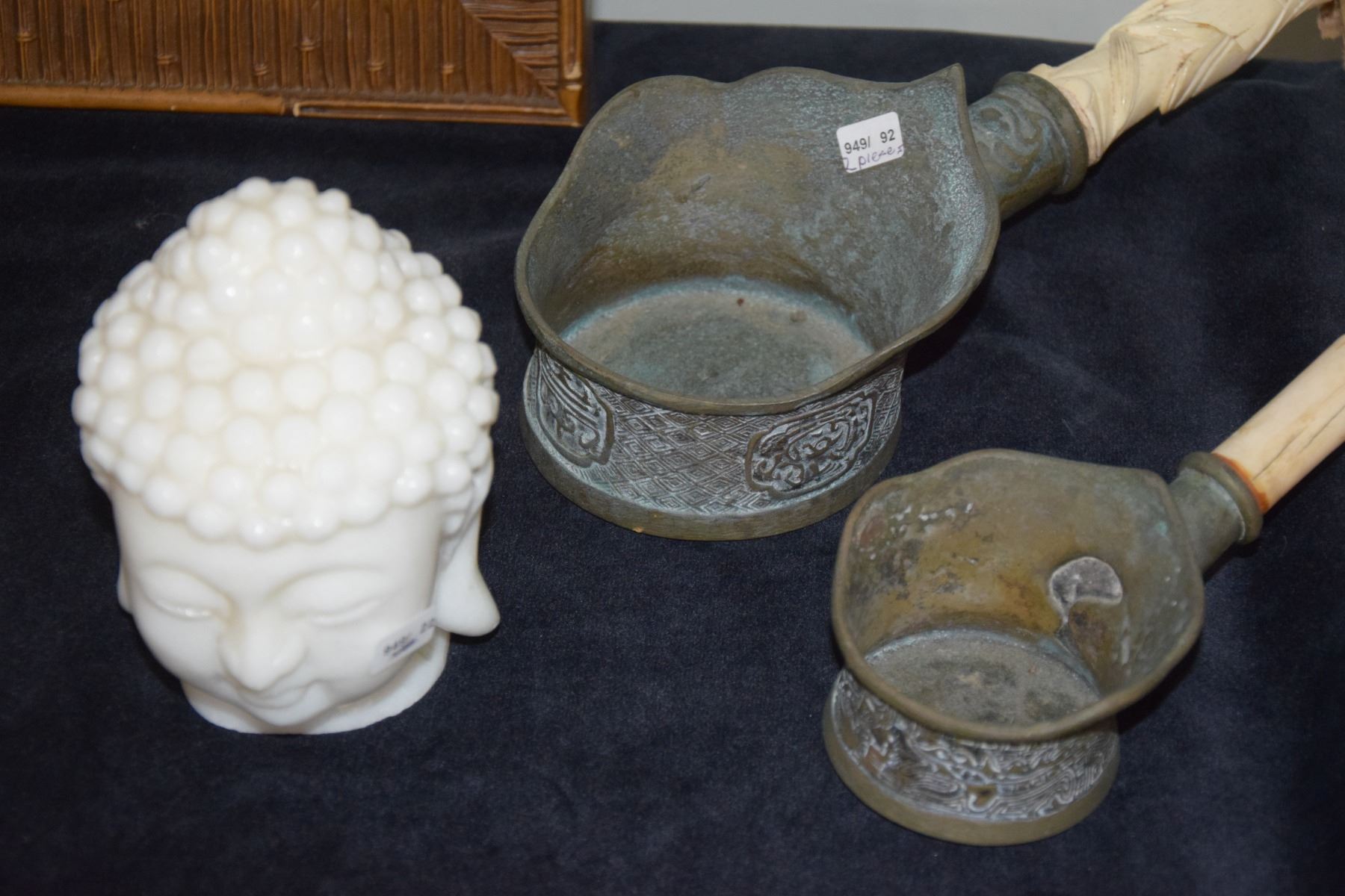 STONE BUDDHA HEAD & 2 CHINESE IRONS WITH BONE HANDLES (3 PCS)