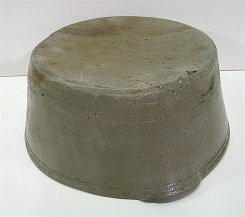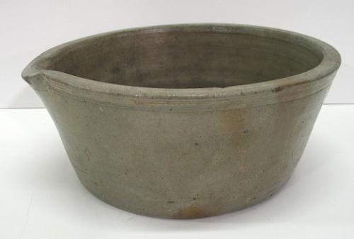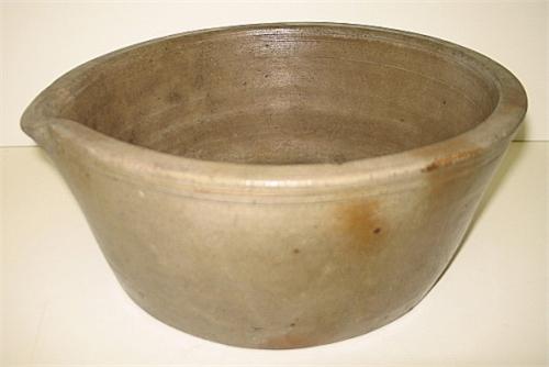 STONEWARE BATTER BOWL. Shows one minor chip at outside of lip. 4.75" H, 11.25" Dia.