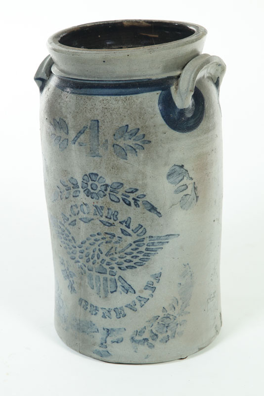 American, 3rd quarter-19th century. Stenciled cobalt label with American eagle for "A. Conrad, New Geneva. Pa". Crack at rim. 15"h.