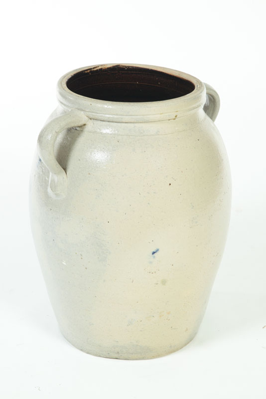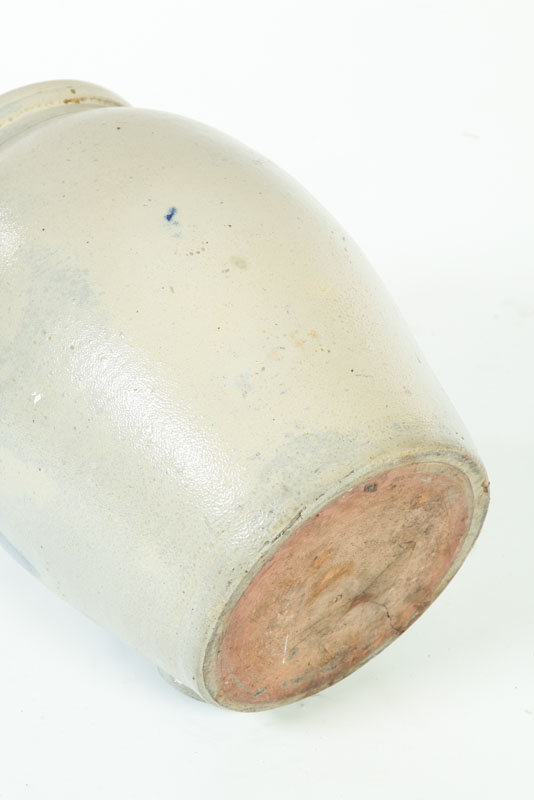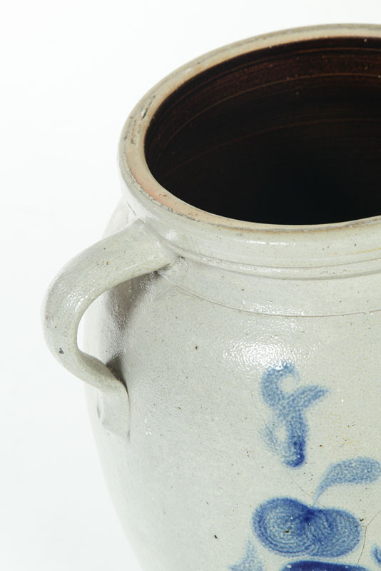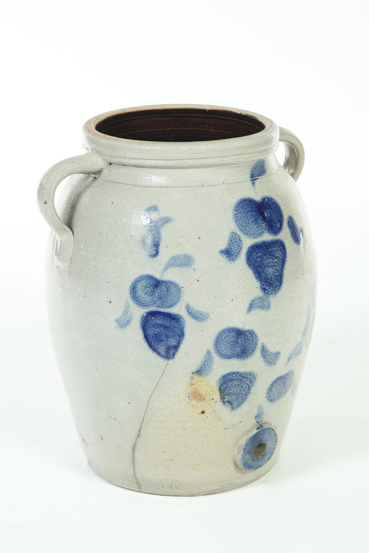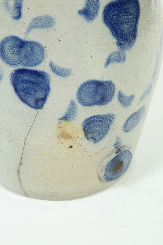 American, mid 19th century. Ovoid with double handles and bright cobalt "8" with stylized fruit. Split. 18"h.
