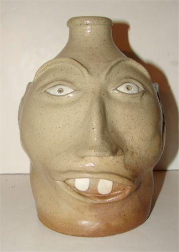 SOUTHERN STONEWARE FACE JUG. Signed illegibly on bottom. 7” H