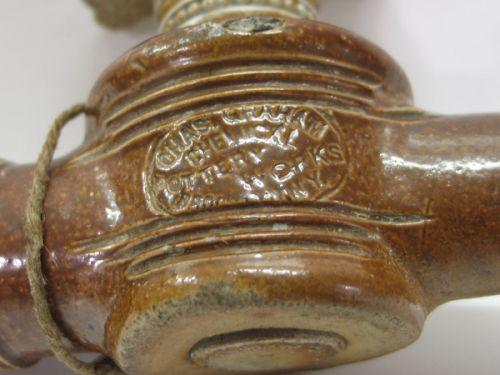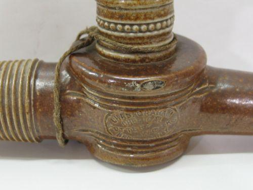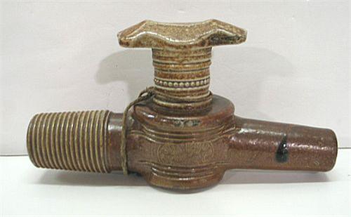 STONEWARE FAUCET. Brown glaze. One end is threaded. Has separate stoneware on/off valve. 7” L