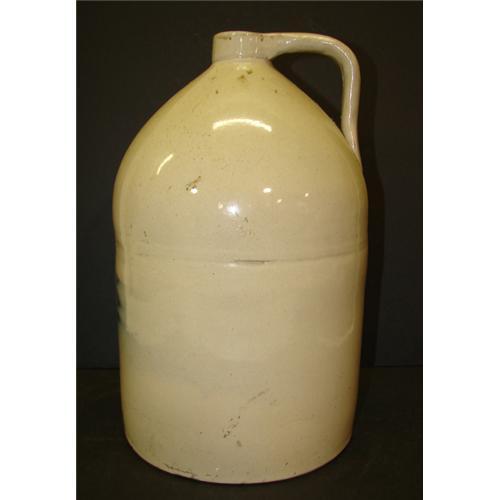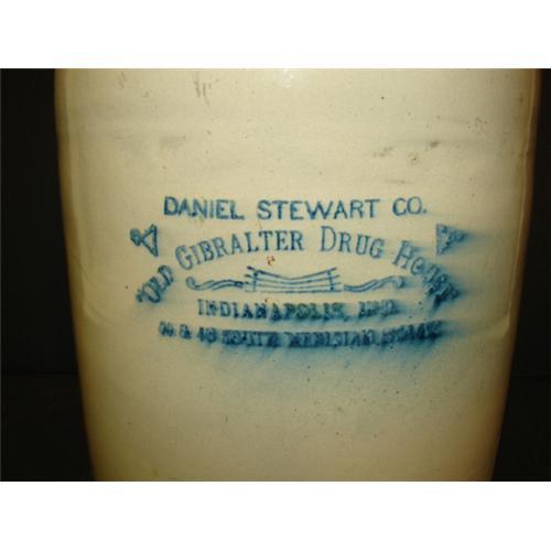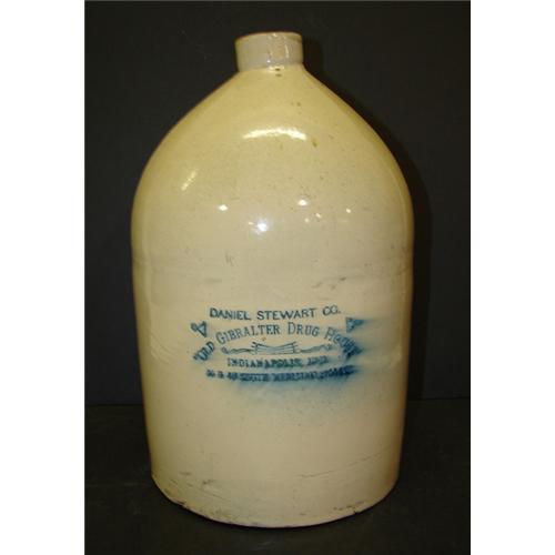 STONEWARE JUG WITH HANDLE. Cobalt blue text on body reads “Daniel Stewart Co./Old Gibralter Drug House/Indianapolis, Ind.” Shows crazing throughout. 13.5” H