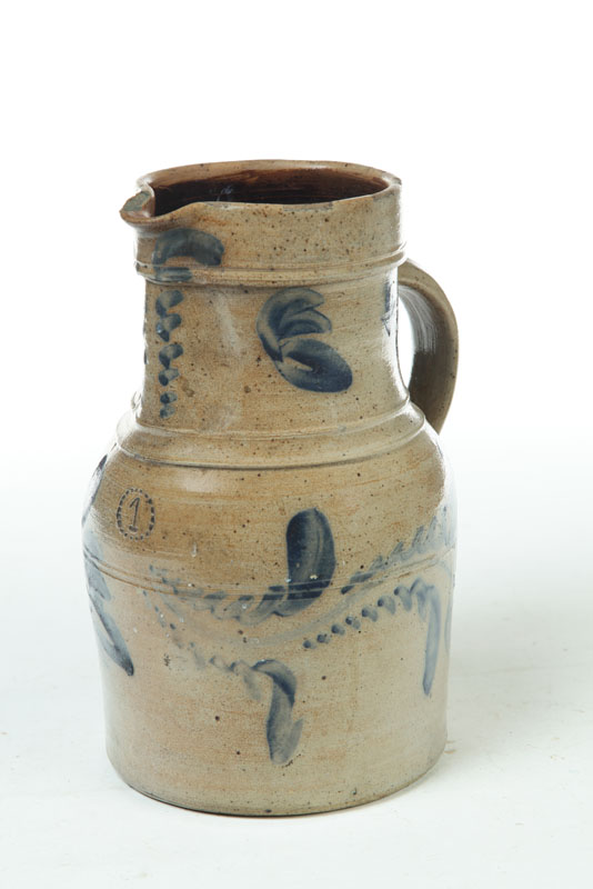 American, mid 19th century. Straight sided with brushed cobalt tulips and impressed "1" in a circle. Possibly Remmey (Philadelphia). Applied handle. Spout chip.11"h.