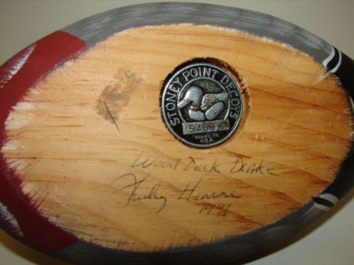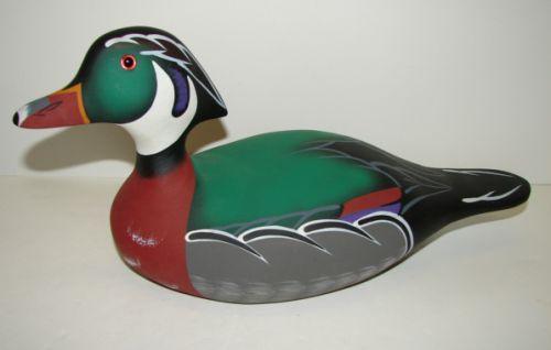 STONEY POINT WOODDUCK DRAKE DECOY. Slightly turned head. Glass eyes. Marked on bottom with Stoney Point Decoys label and numbered "54839". Signed on bottom "Wood Duck Drake/Shirley Hearne/1991". 12.5" L