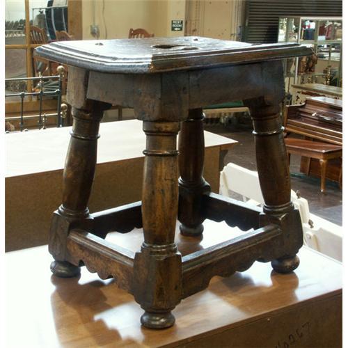 STOOL: Stool in the style of early 18th century Pennsylvania Dutch, molded top edge, turned legs, molded and formed stretcher, bun feet. 17''h x 12'' x 16''w