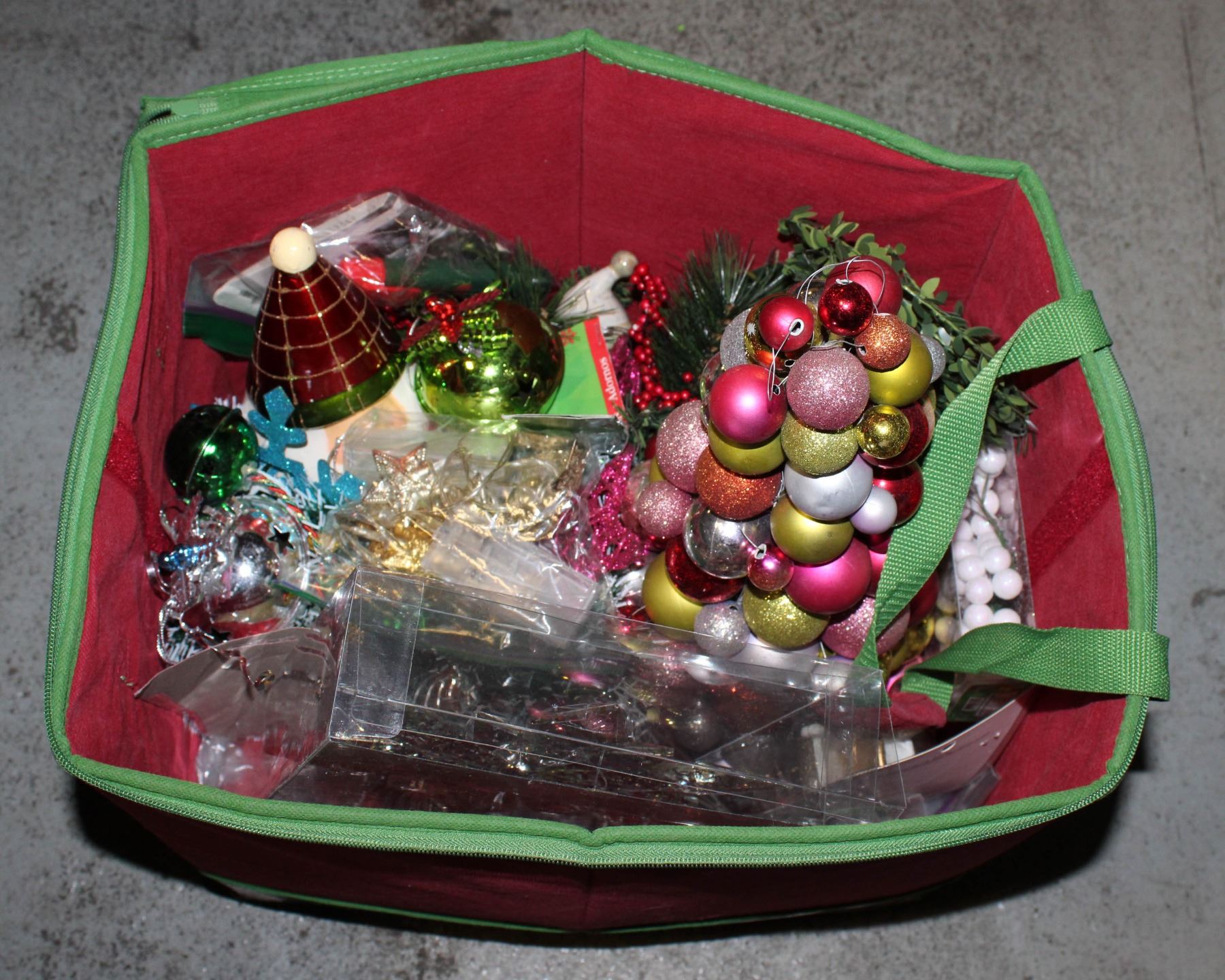 STORAGE BIN WITH CHRISTMAS DECORATIONS