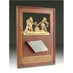 STORE AUTOMATON CLOCKWORK RING DISPLAY. Clockwork display for the W.W.W. Guaranteed Ring Co. clock mechanism moves hammers in the hands of two cast aluminum ringmakers. SIZE: 16”w. x 23” h. x 4 1/2” d. CONDITION: Fair to good; clock mechanism not currently working. Diamond-shaped front panel ornamentation separated and missing wood trim. PF 1-3638 (250-450)