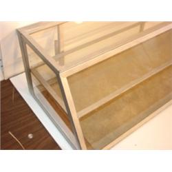 STORE COUNTER TOP DISPLAY SHOWCASE. Two tiered. Two sliding glass doors on back. Slant front. 28" L, 11" D, 8.5" H