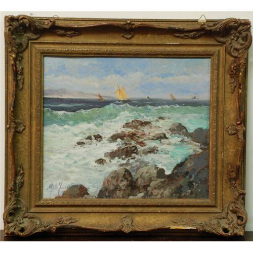 DESCRIPTION: ?STORM AT CAPRI? WONDERFUL WORK SIGNED BY MICHELE FEDERICO (1884-1966). The painting shows a sea storm and a foreshortening of Capri coast, depicted with the bird's eye view, waves of the different dimensions follow one another and foam toward the rocks and in consequence of the leaden colour of the sky, assume infinite shades, from the bladder green to the leaden grey. The sky is jubilation of clouds swollen with rain, dense and dark, suddenly torn open by the creating strength of the sun that composes the roughness and assures that the storm is ended. The foam of waves and wind, the lashing roar of great and impetuous waves that, in a secular fight, break against the rough rocks, as lovers who argue, that in the rage of the moment throw each other , with the strength of the equal and far reasons. But here is the feeling that compares again and wins the conventions and as a ray of sun, all of a sudden, the link occurs to the mind, the love that harmonizes the contraries, rounds off the corners , balances the parts and the waves die down, the rocks sweetly are licked. The style chosen by the author is conform to the reality, you can note the roughness of the rocks, created with the whole range of browns colours, and he makes a large use of pure white in order to create the breaking of the waves, the presence of sailing boats emphasizes the movement of waves. The painting is able to communicate very strength, and involves the look in each corner, to look at it is ...