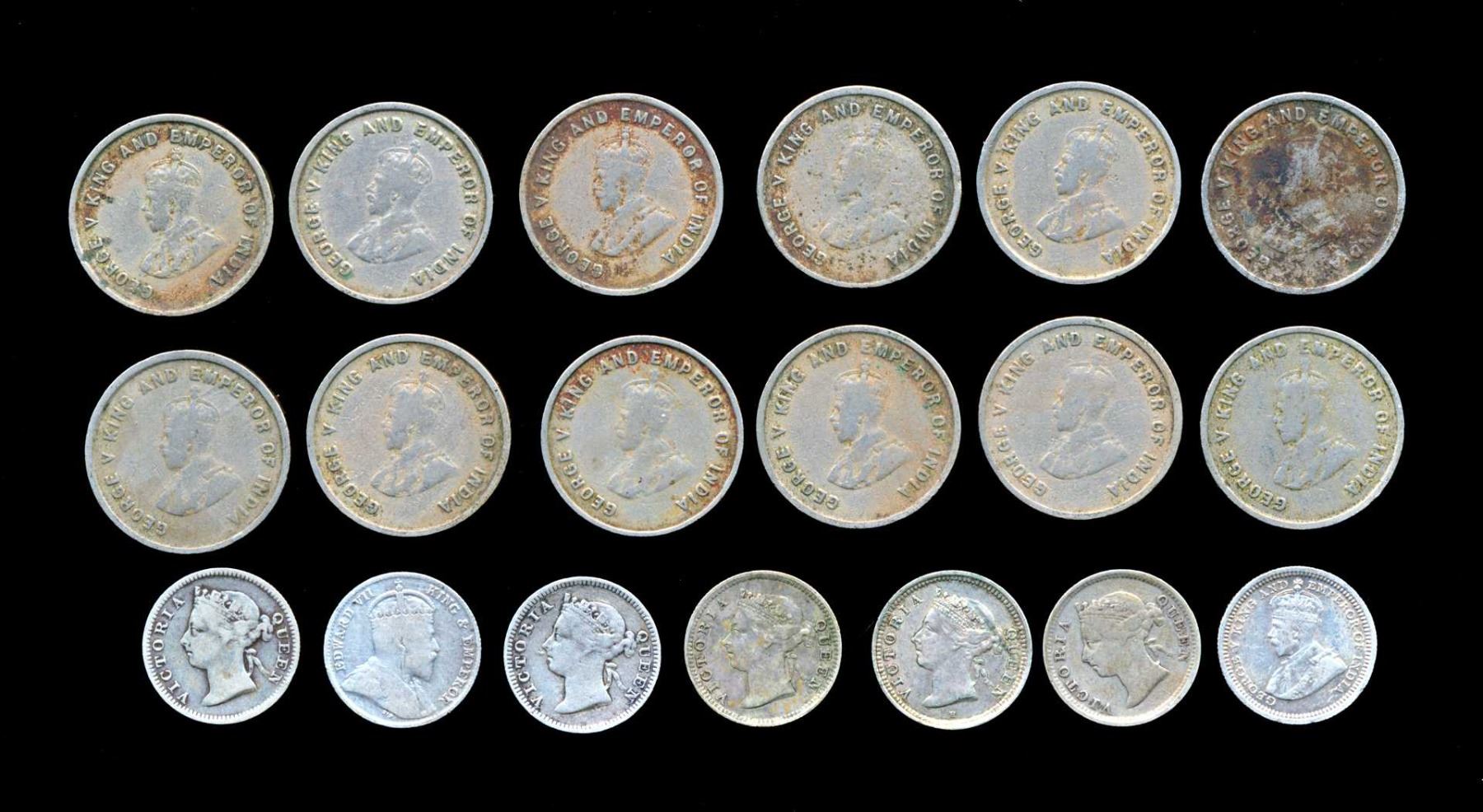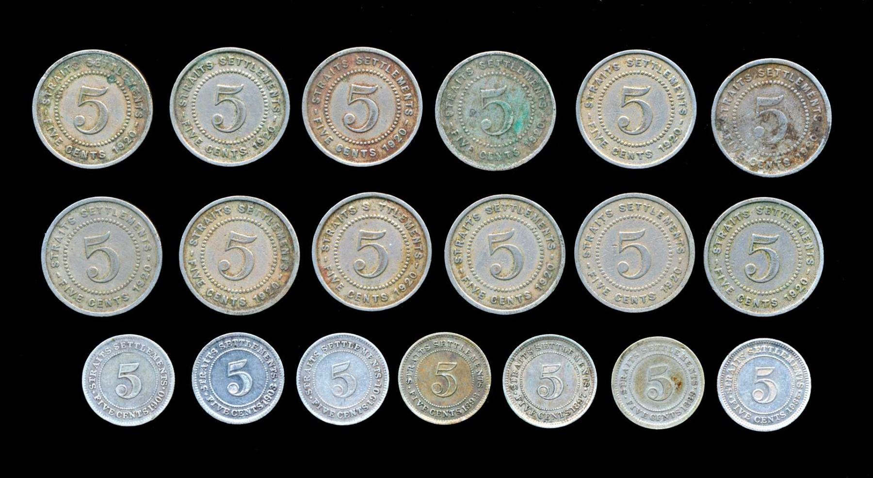 STRAITS SETTLEMENTS 5 Cents 1889-1935. A Lot of 19 Coins Very Good-Very Fine
