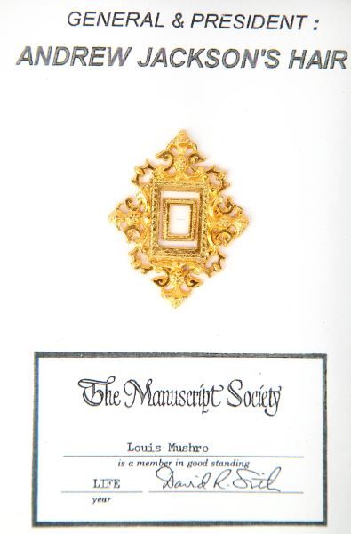 Strand of Andrew Jackson's hair with authentication from Louis Mushro of The Manuscript Society. Frame measures 13 by 11 inches.