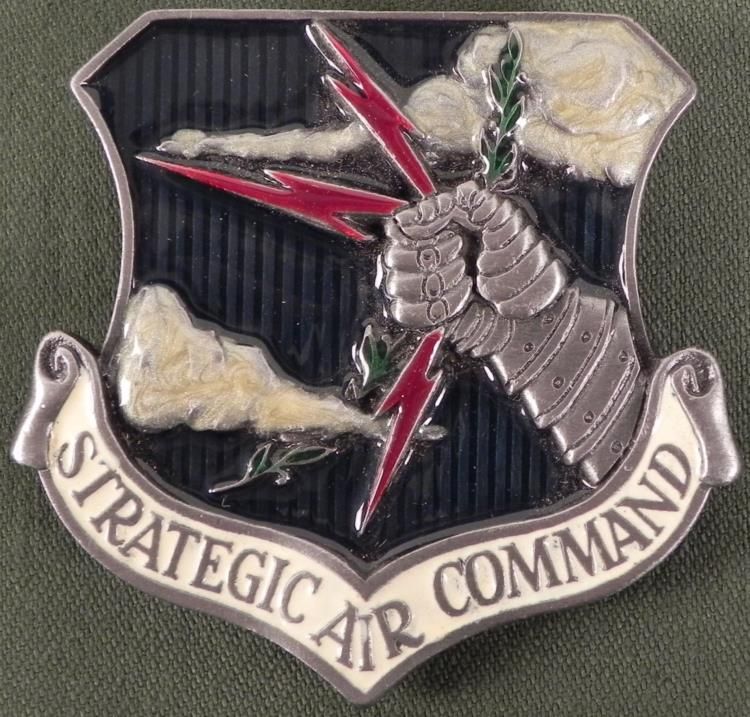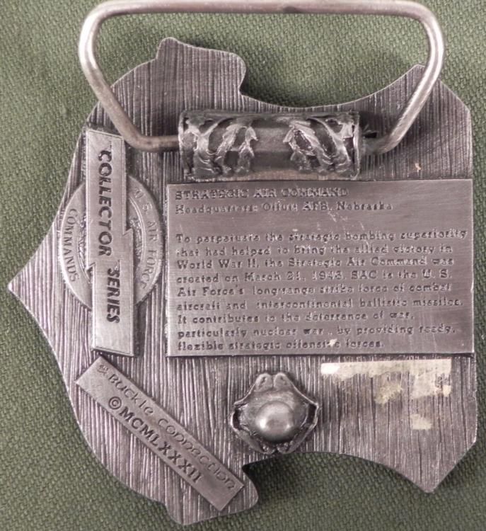 STRATEGIC AIR COMMAND LARGE BUCKLE-ENAMEL & METAL-REVERSE: HAS WWII INSCRIPTION OF SAC2 3/4" -WELL MADE -HAS SAC STORY OF WWII ON BACK -DATED 1982--QUALITY BUCKLE