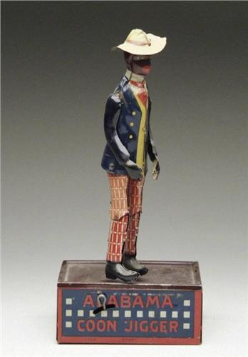 STRAUSS ALABAMA COON JIGGER. Spiffy black man does comical jig atop lithographed box. SIZE: 10-1/2" t. CONDITION: Minor wear and scuffing, overall very good. 1-4727 MC
