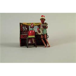 Lot # 908 STRAUSS HAM AND SAM BLACK TOY. U.S.A. Copt. 1921. Classic piano toy features black jigger with banjo. Animated black player sits at lithographed piano showing many dancing caricatures. SIZE: 7-1/2" h. CONDITION: All original and in good, plus working condition. 1-29431 (300-500)