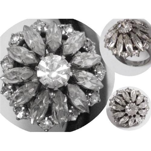 Right from the deco period comes this huge setting of baguettes in a cocktail cluster. Stones are bright and not cloudy ( photo is fuzzy). The setting is 1" wide and stands off your finger ¾". The beautiful domed chandelier effect is more striking than the photos. The ring will go up to a 7. Stones are bright, band has wear to the silver color.