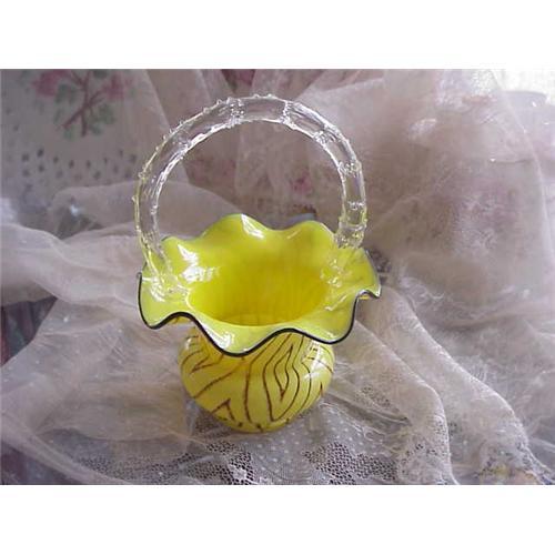 Absolutely beautiful Czech art glass basket in a most lovely yellow with brown pattern, the clear glass handle is textured as if twig like. It stands a tall 7 inches, 5 inches across the widest portion. This delightful basket is in excellent condition, no chips or cracks, just lovely! A fabulous addition to your collection of fine art glass.