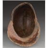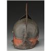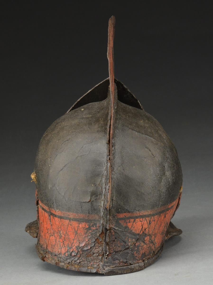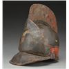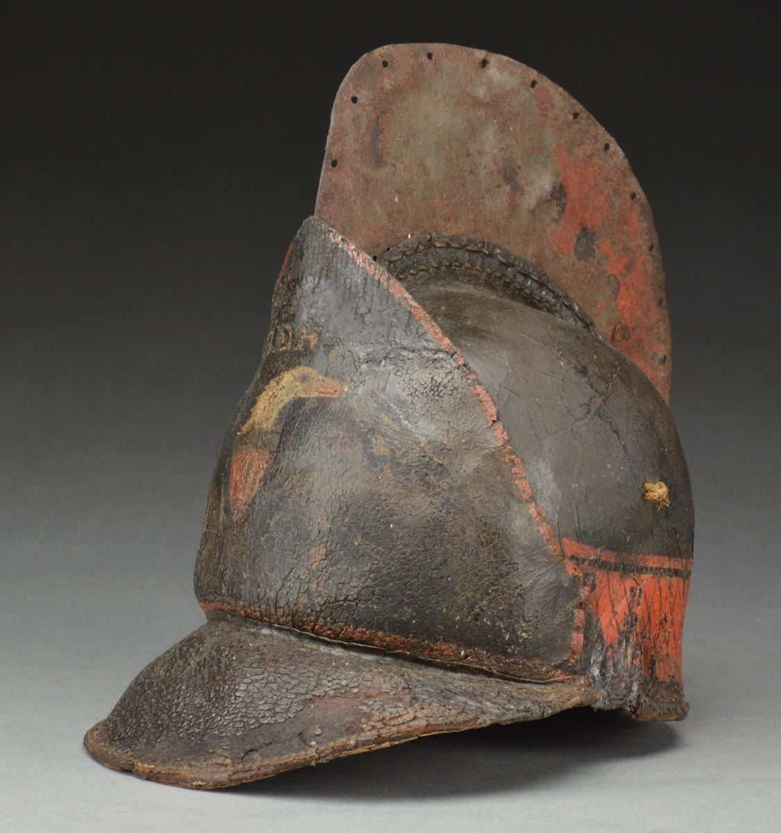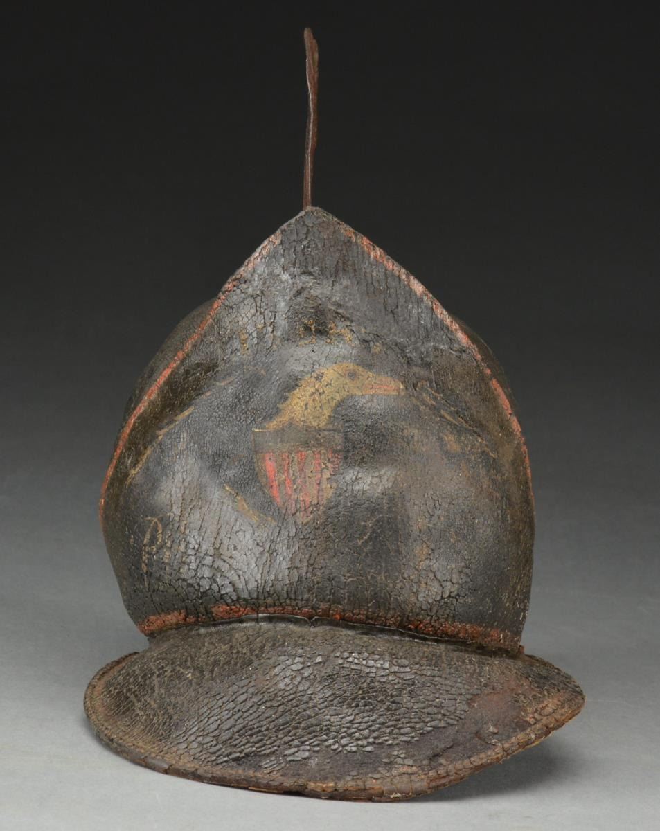 WITH “LIBERTY” FRONT PLATE. This rare 1795-1815 leather dragoon helmet measures approx. 10 1/4" high & 11 1/2" in width. The body, front plate & visor of the helmet are leather w/ a 3 1/2" painted tin comb attached to the top. The front plate has a left facing American eagle surmounted by the word “LIBERTY” arched over his head. The eagle is done in white, gold & red paint & the word “LIBERTY” is also in white. The edges of the front plate are trimmed in red & there are strands of laurel leaves down both sides under the word “LIBERTY”. There is another word painted in white script letters under the eagle that appears to begin w/ “B”, but remains indecipherable. The leather visor is also trimmed in leather & shows a Moroccan leather inside liner. The skull of the helmet has a red painted 2" cross hatched border around the base. There is a cord on the right & left sides just above the border for attachment of a cockade & plume. The tin comb is painted red w/ 6 black painted circles descending in size from 1 1/2" to 3/8". There are 15 holes at the edge of the comb originally used to attach a bear skin crest. The interior of the helmet shows only remnants of a sweatband extending from the visor liner. CONDITION: remains amazingly solid but shows significant crazing to the finish, particularly on the visor. The red paint on the front plate, skull & comb is worn but is quite visible & attractive. The black painted finish has survived well. The eagle on the front plate is quite visible as is the shield on its chest. The word “LIBERTY” can be easily read. An exceptionally rare & desirable piece of early American military headgear seldom offered at public sale. (02-14893/BF). $4,000-6,000.