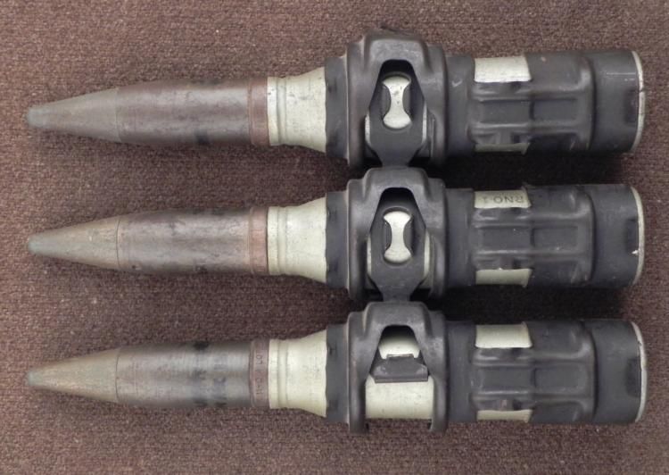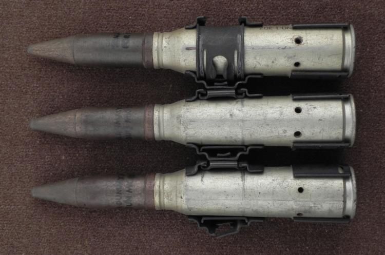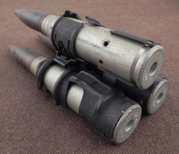 STRIP OF 3 20MM INERT SHELLS FOR USE IN A MK12 GUN-WITH CLIP--7 1/4" TALL * *