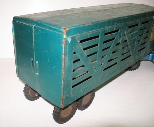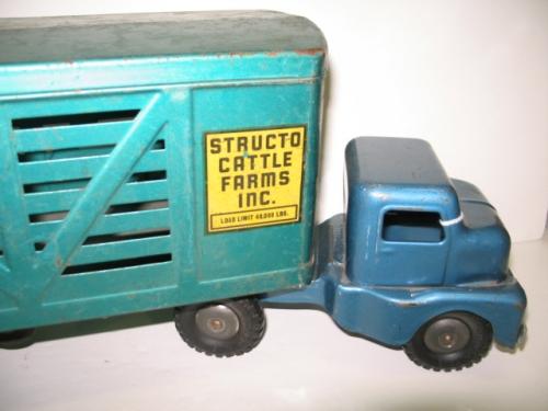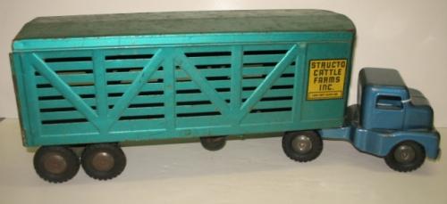 STRUCTO CATTLE FARMS TRUCK AND TRAILER. Marked with labels on both sides of trailer that read “Structo Cattle Farms Inc.” Truck is painted blue and trailer is painted green. Both show signs of wear and loss to paint. 20” L