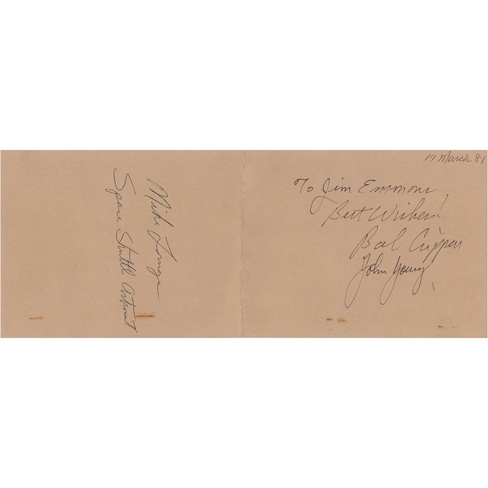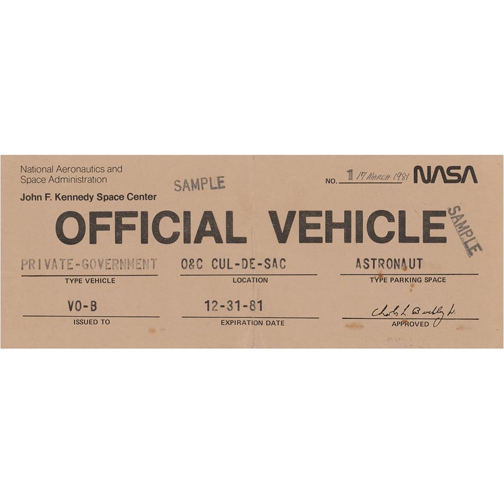 Unusual NASA/Kennedy Space Center "Official Vehicle" parking pass stamped "Sample," 11 x 4.25, dated March 17, 1981, signed and inscribed on the reverse in black felt tip, "To Jim Emmons, Best Wishes! Bob Crippen," "John Young," and "Mike Lounge, Space Shuttle Astronaut." In very good to fine condition, with a central vertical fold and minor staining to the front.
