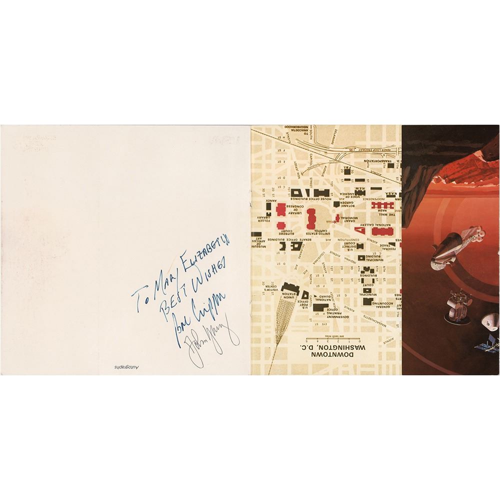 Official Manned Flight Awareness program celebrating the 10th anniversary of STS-1 in 1991, 8 x 8, 28 pages, signed and inscribed in the rear cover in ink, "To Mary Elizabeth, Best Wishes, Bob Crippen," and "John Young." In fine condition. Accompanied by an invitation to the reception at the National Air and Space Museum on April 12, 1991, and a photograph of Bob Crippen at the event.